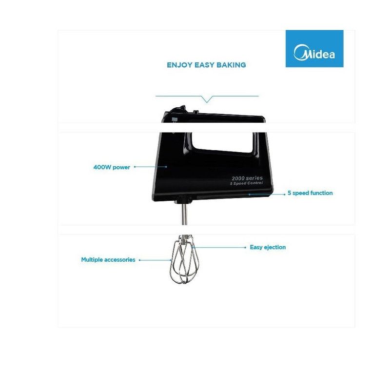 Midea Hand Mixer Electric Whisk 400W with 5 Speeds + Turbo Button, Twin Stainless Steel Kneader & Beater For Mixing, Whipping, Whisking, Kneading, Light Weight Egg Beater with Ergonomic Design, HM0293