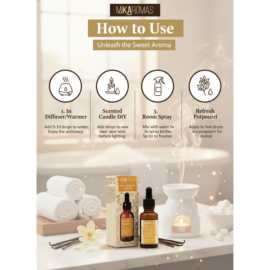 Perfect for use in aroma diffusers, humidifiers, candles, soaps, and DIY home fragrances, the Mikaromas Vanilla Oil spreads a deliciously sweet and long-lasting scent that lingers for hours