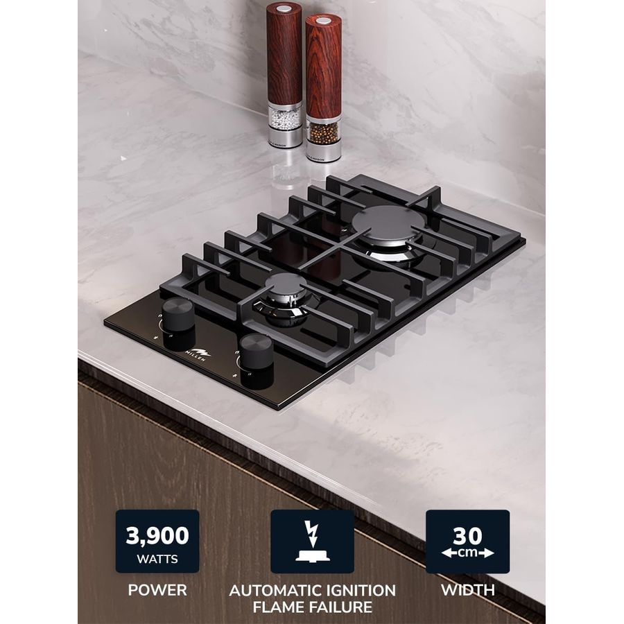 MILLEN MGHG 3002 BL 30 cm Built-in 2 Burners Gas Hob - Glass Finish, 3900 Watts, Mechanical and Electric Ignition Control, 3 Year Warranty - Black
