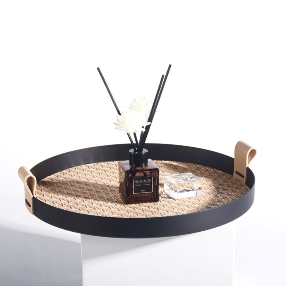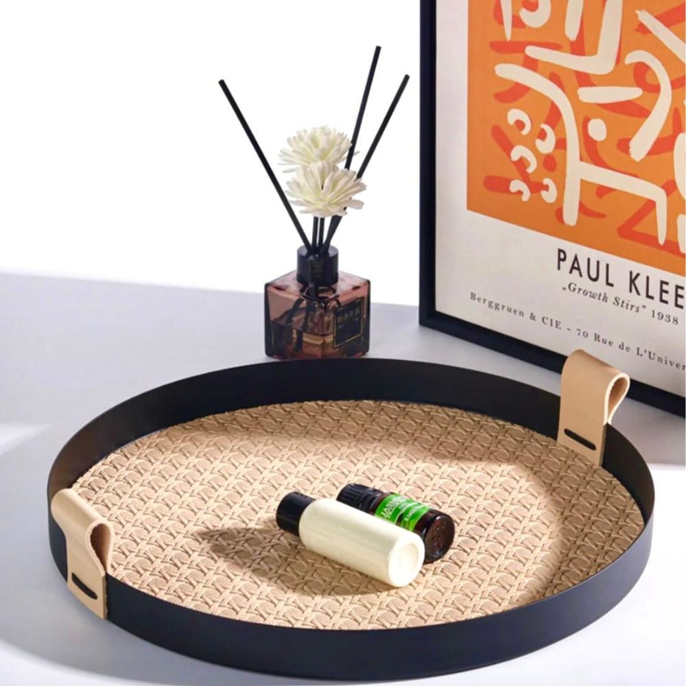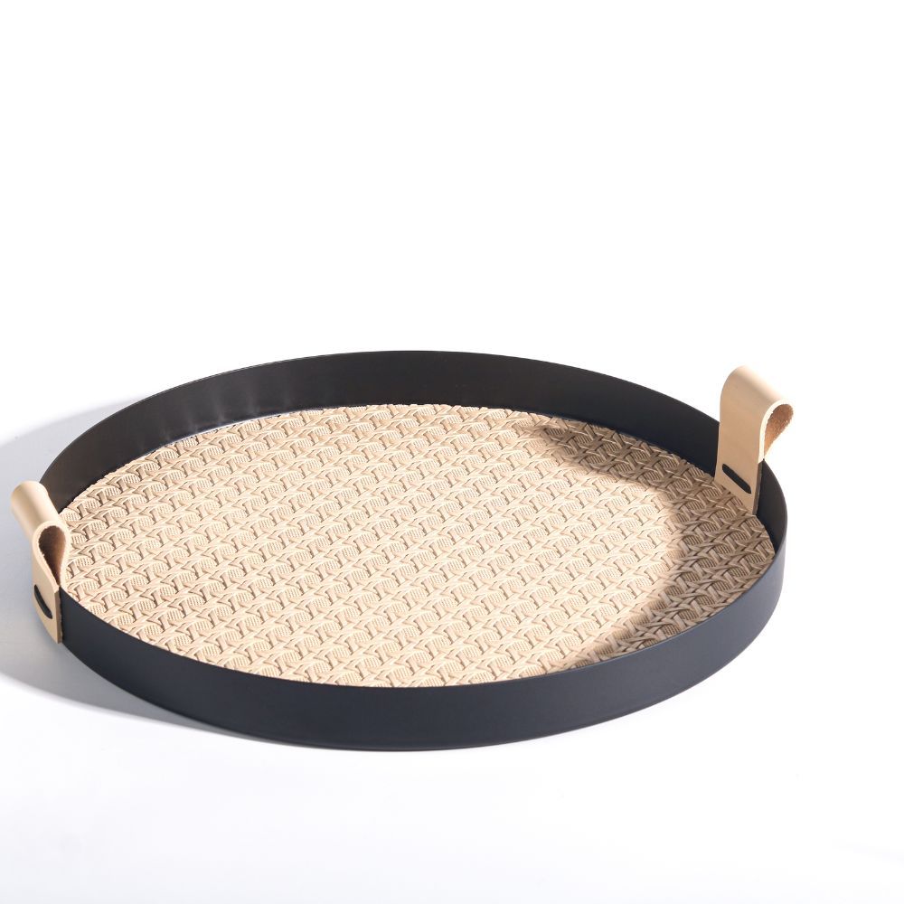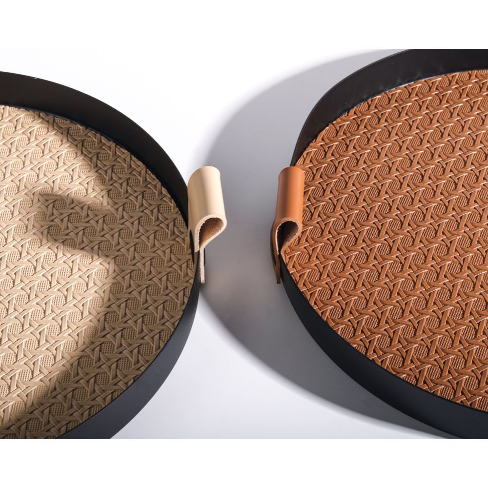 Mitri- Round Stainlesss Steel Tray With Leather- Beige