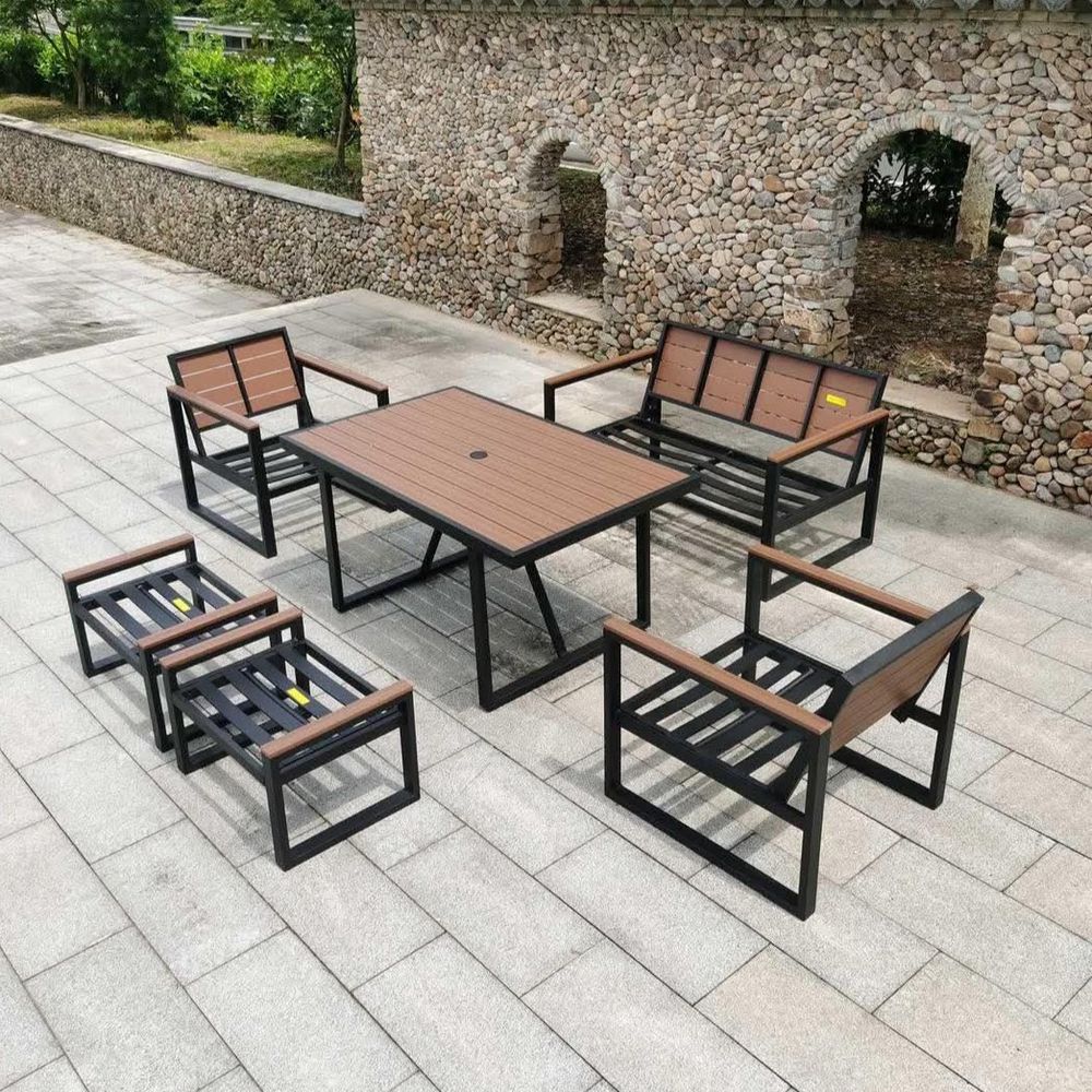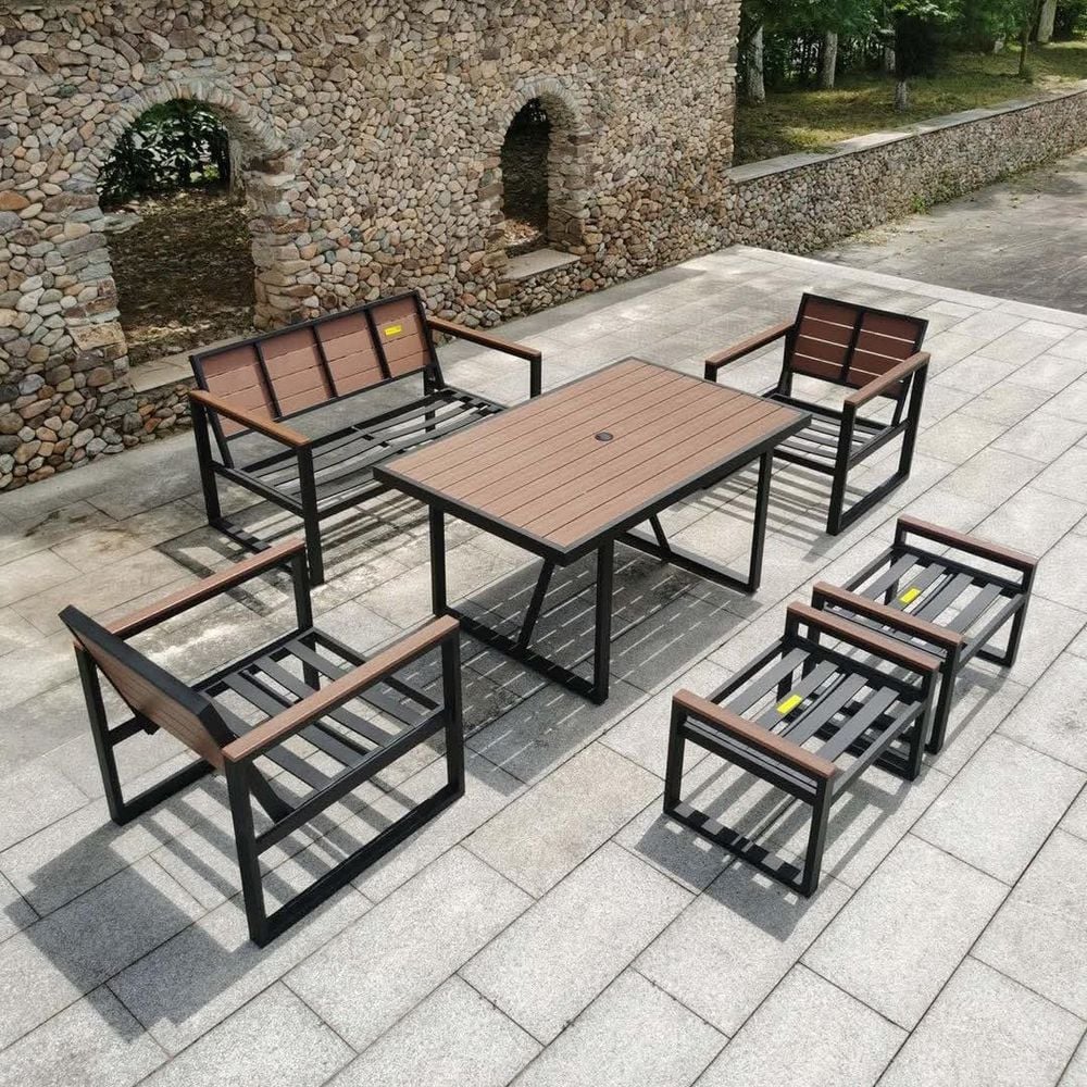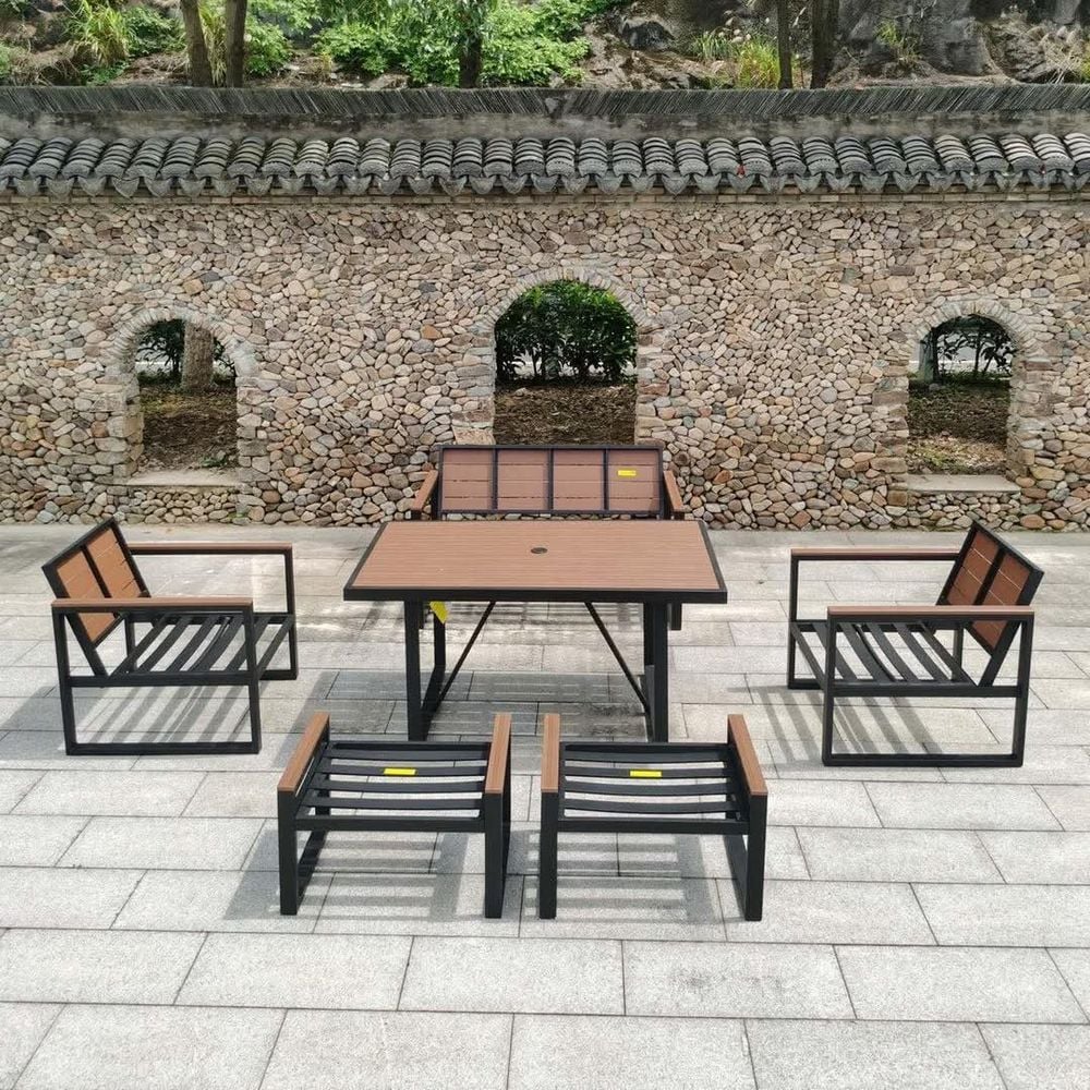 Modern Aluminium Outdoor Garden Set – Black Frame with Faux Teak Finish & White & Beige Cushions