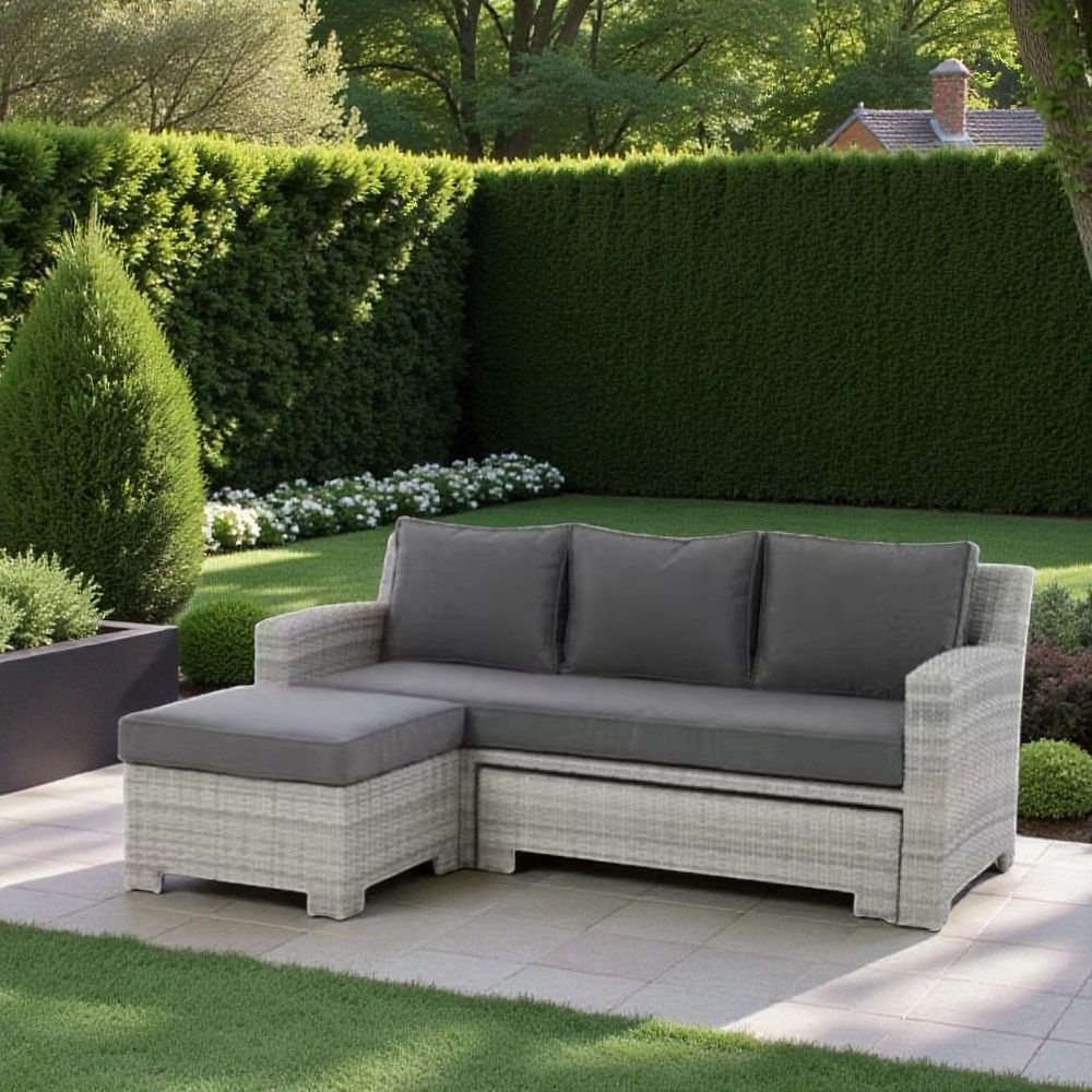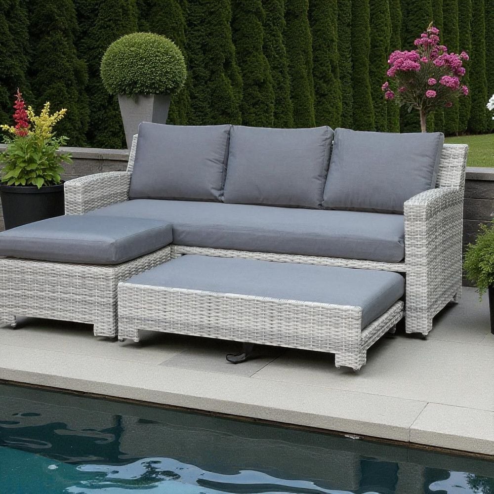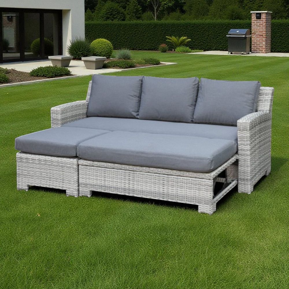 Modern Outdoor Rattan Convertible Sofa cum Daybed – Light Grey Wicker Frame with Plush Cushions