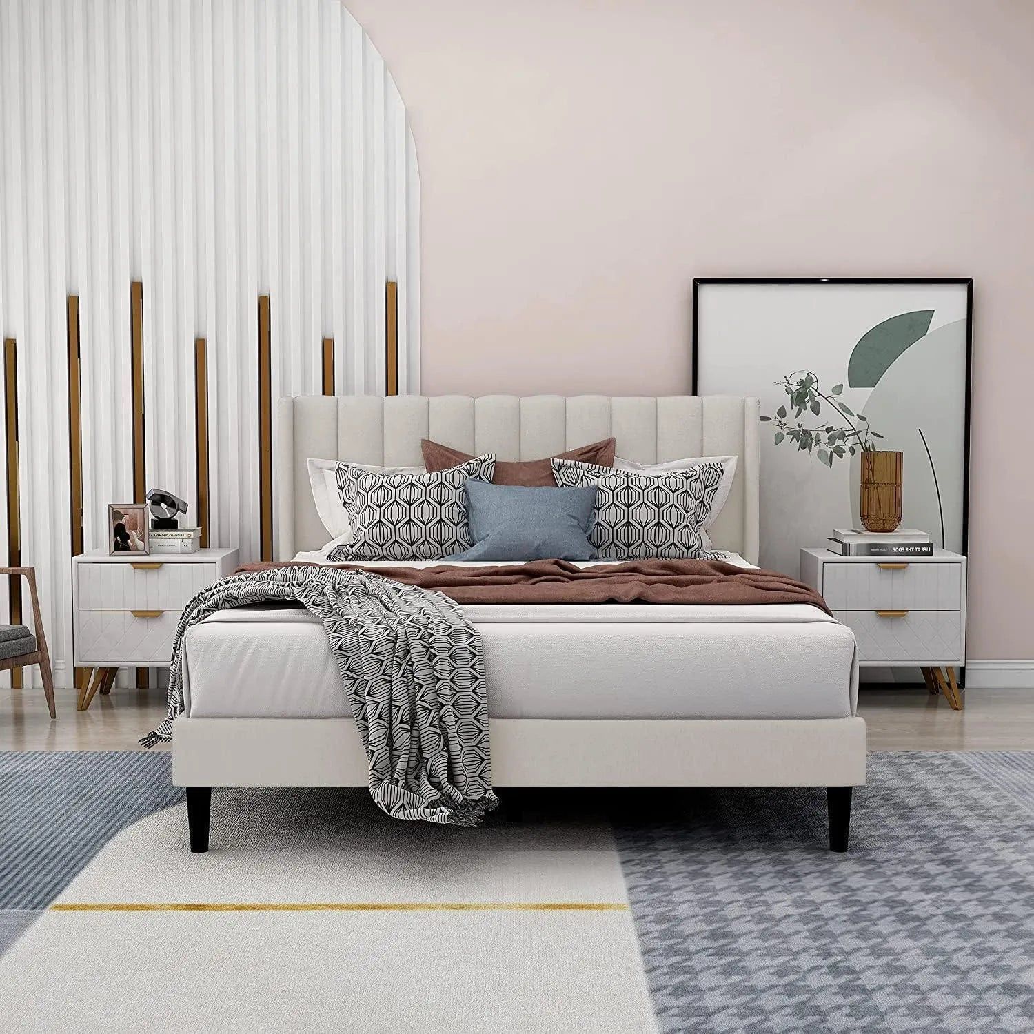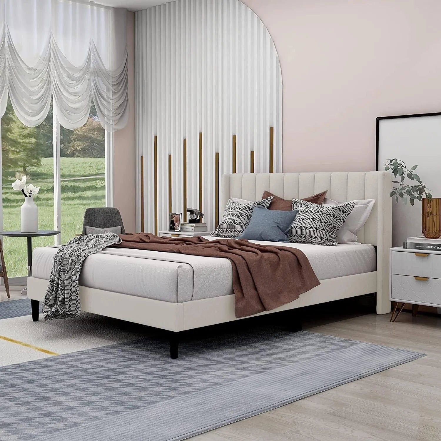 Modern Rectangular Velvet Upholstery Bed with Soft Wingback Headboard Beige (Queen)