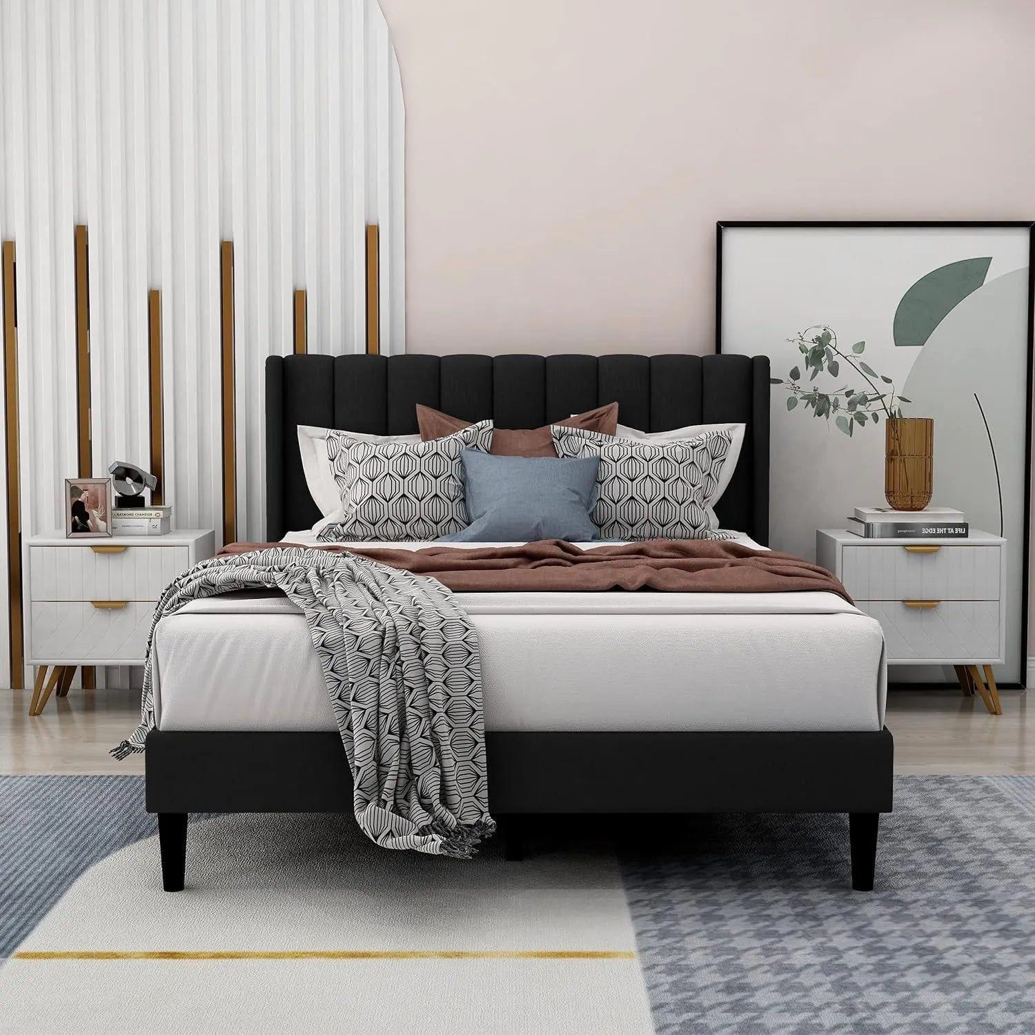Modern Rectangular Velvet Upholstery Bed with Soft Wingback Headboard Black (Queen)