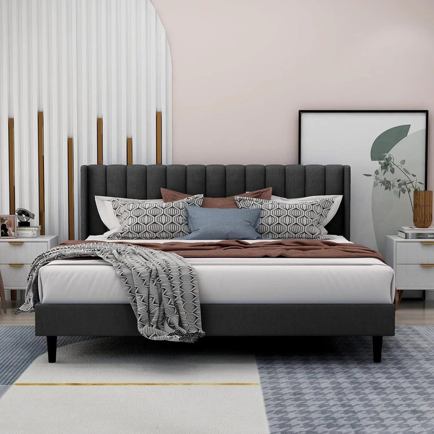 Modern Rectangular Velvet Upholstery Bed with Soft Wingback Headboard Dark Grey (King)