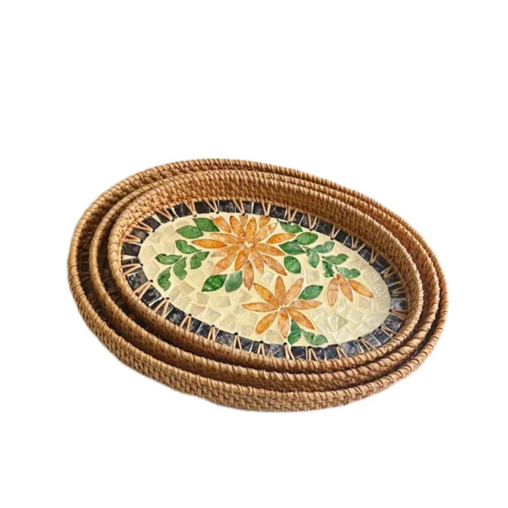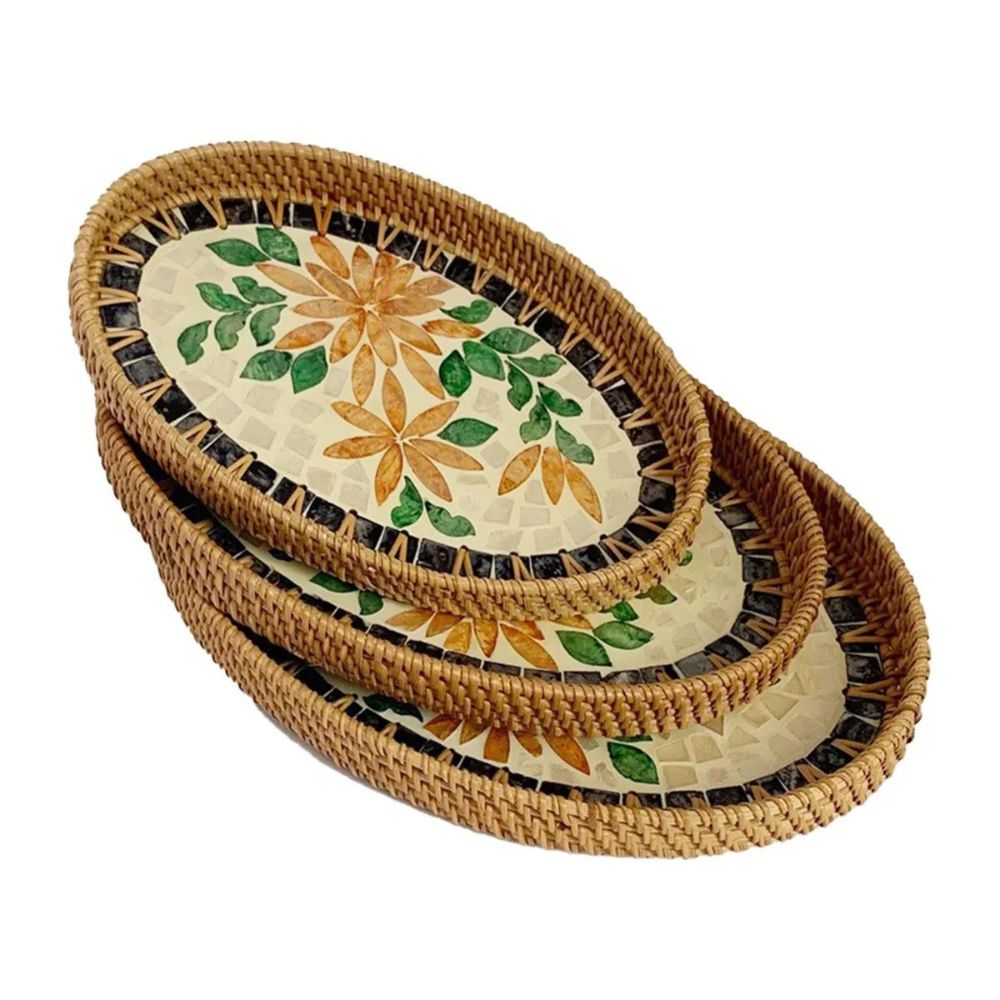 Natural Sea Shell Handwoven Rattan Oval Serving Tray-3 Pc Set-Yg