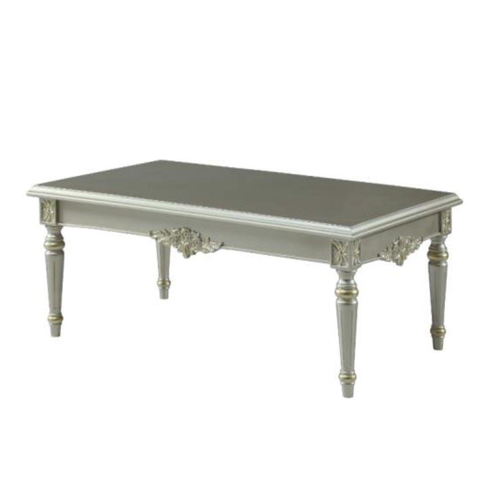 Hand painted finish on wooden carved areas in shimmer champagne and metallic gold.