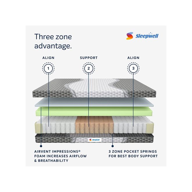 Ortho Pro Spring Queen Bed Size Impressions Memory Foam Mattress With Airvent Technology And 3-Zone Pocket Spring White -190x 160x 25 cm