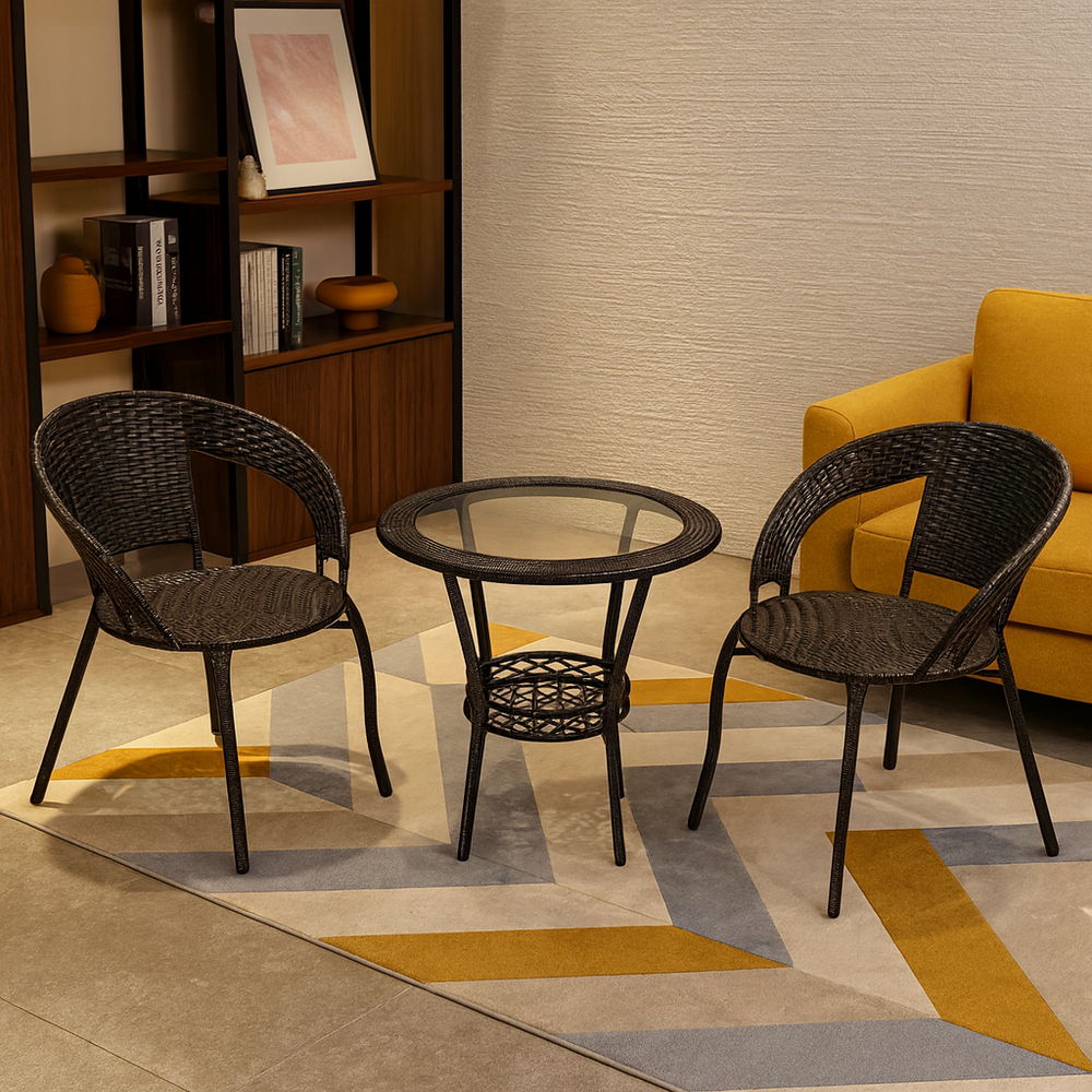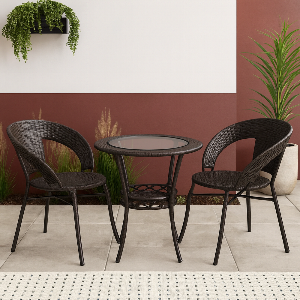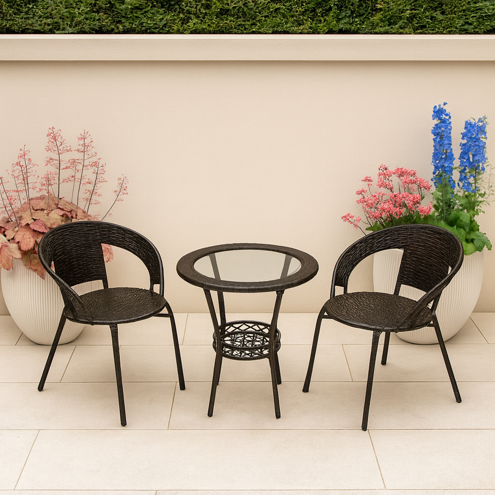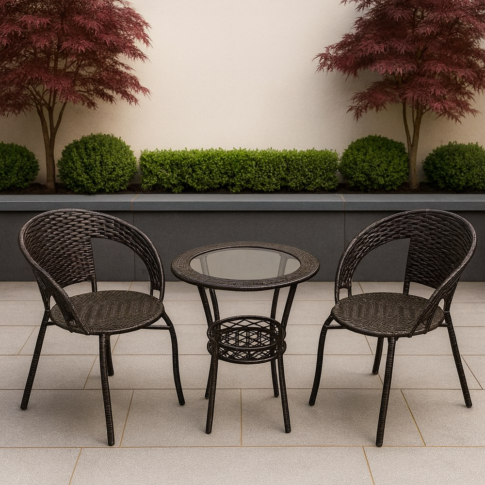 Includes a modern glass-top table and two ergonomic wicker chairs