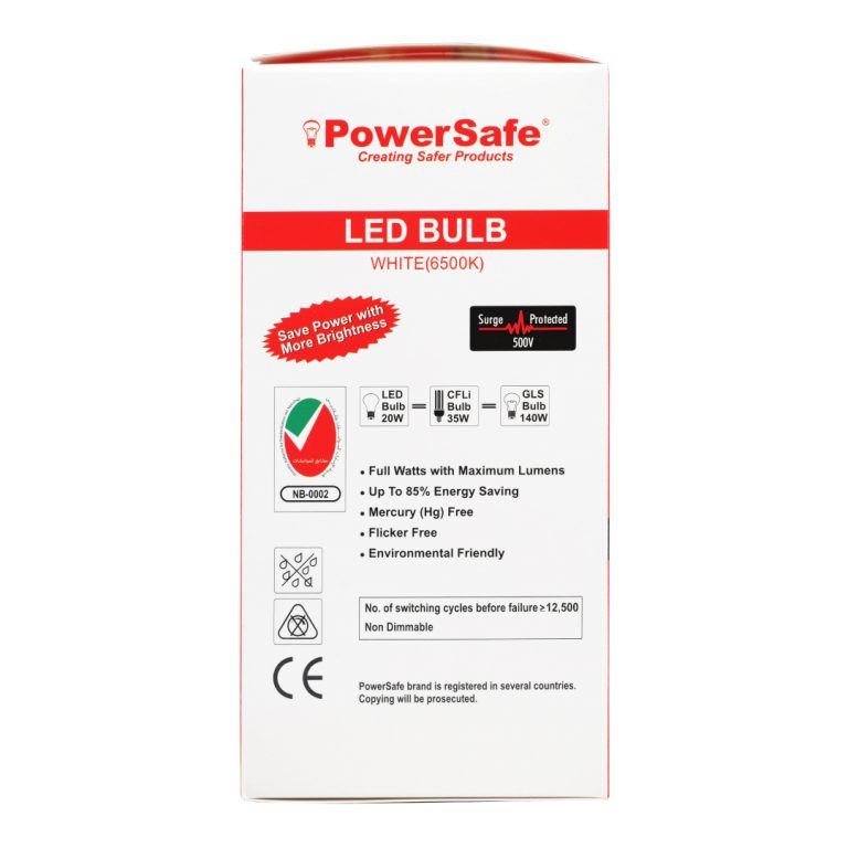 PowerSafe LED Bulb 20W Daylight E27, 1700 Lumen, 6500K, 85% Energy Saving, 15,000 Hours Lifespan, with Surge Protection, ESMA Approved
