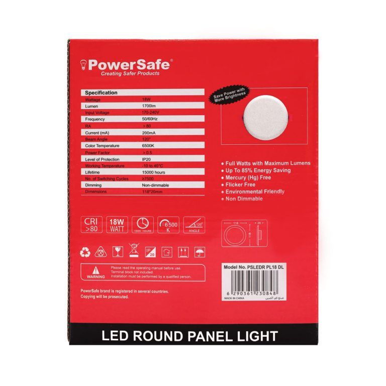 PowerSafe LED Round Panel Light 18W Daylight, 1700 Lumen, 6500K, 85% Energy Saving, 15,000 Hours Lifespan, with Surge Protection, ESMA Approved