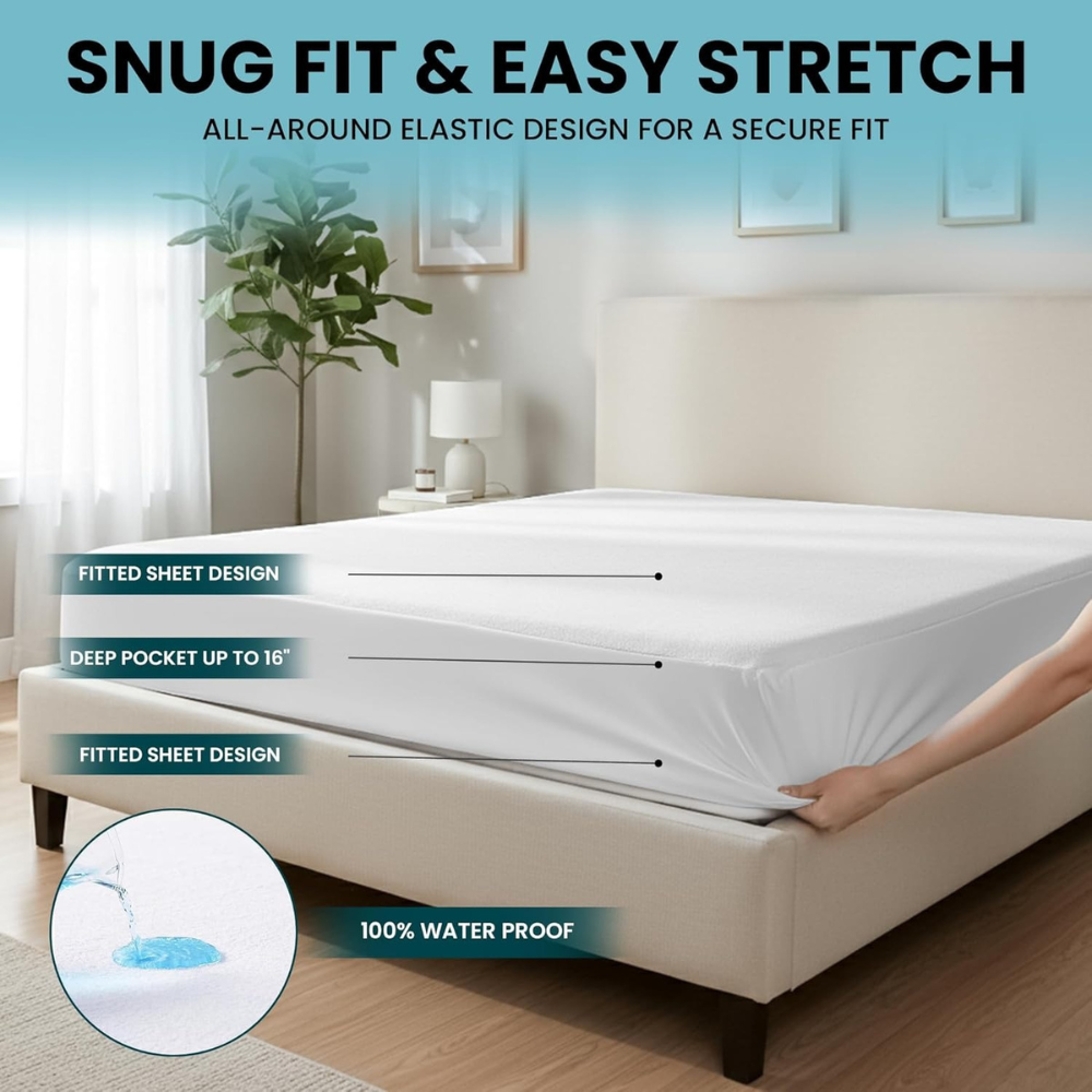 Premium Mattress Protector – Waterproof, & Ultra Soft Breathable Noiseless Washable Cotton Terry Bed Mattress Cover for Comfort & Protection (White, 180x200cm)