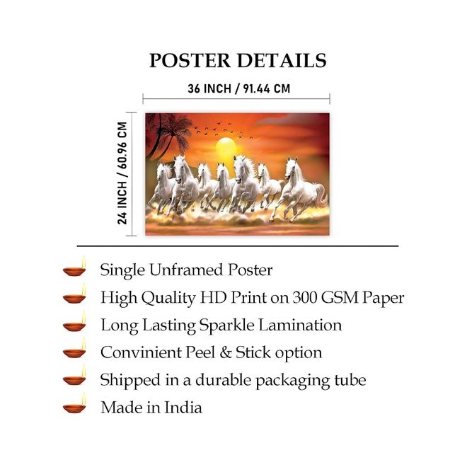 Rolled Sparkled Vastu Seven Running Horses Sunrise Vinyl Art Print For Room Décor Digital Reprint 36 Inch X 24 Inch Painting