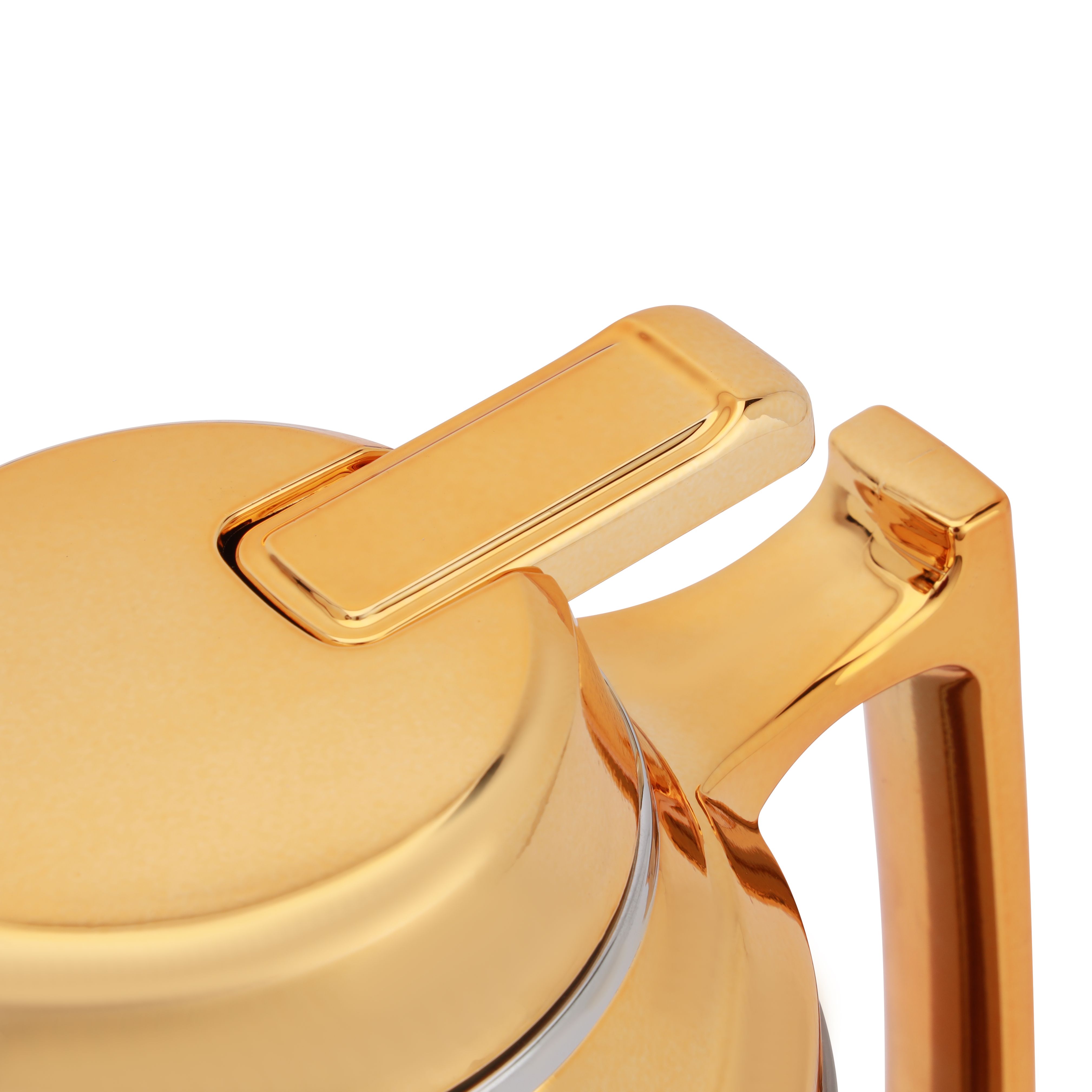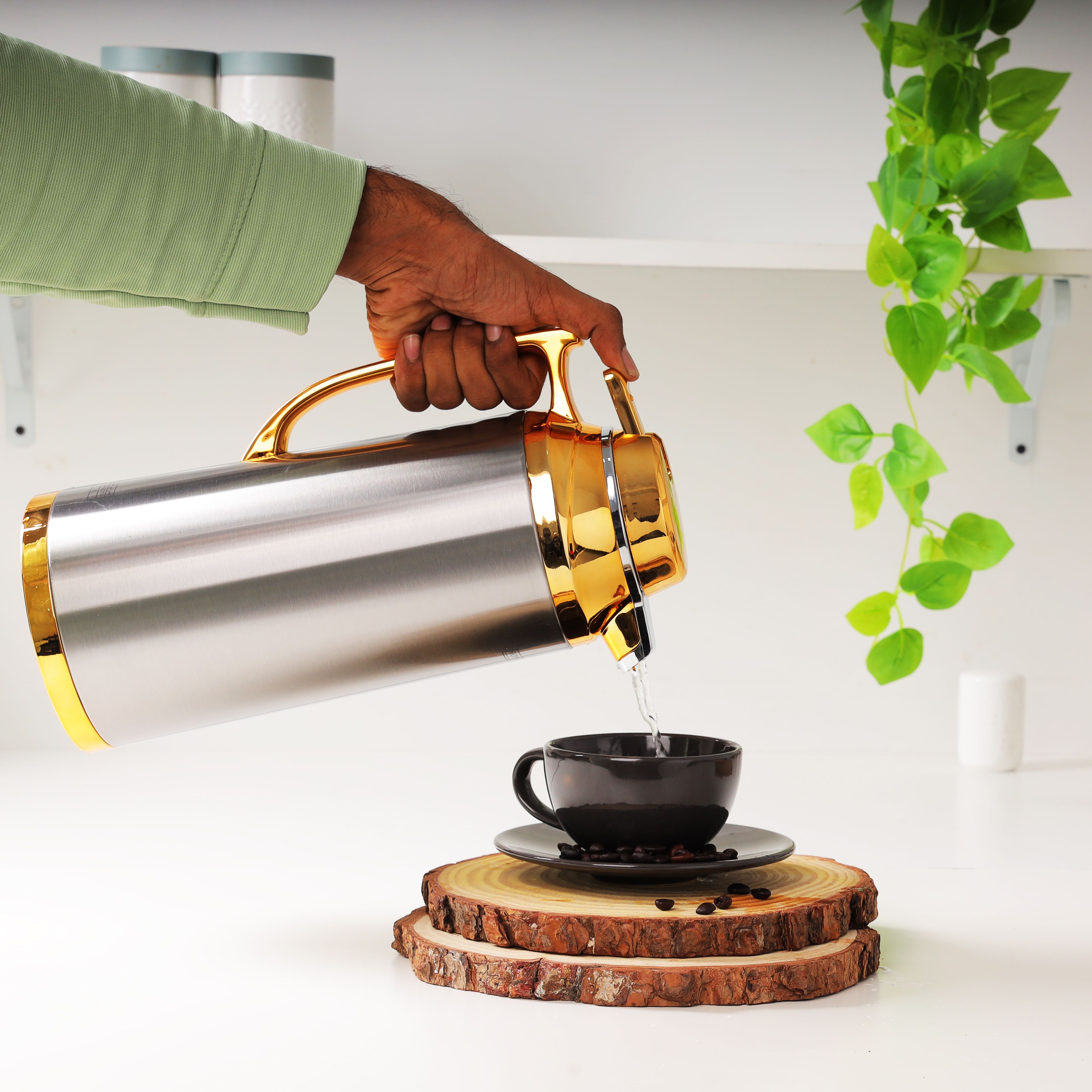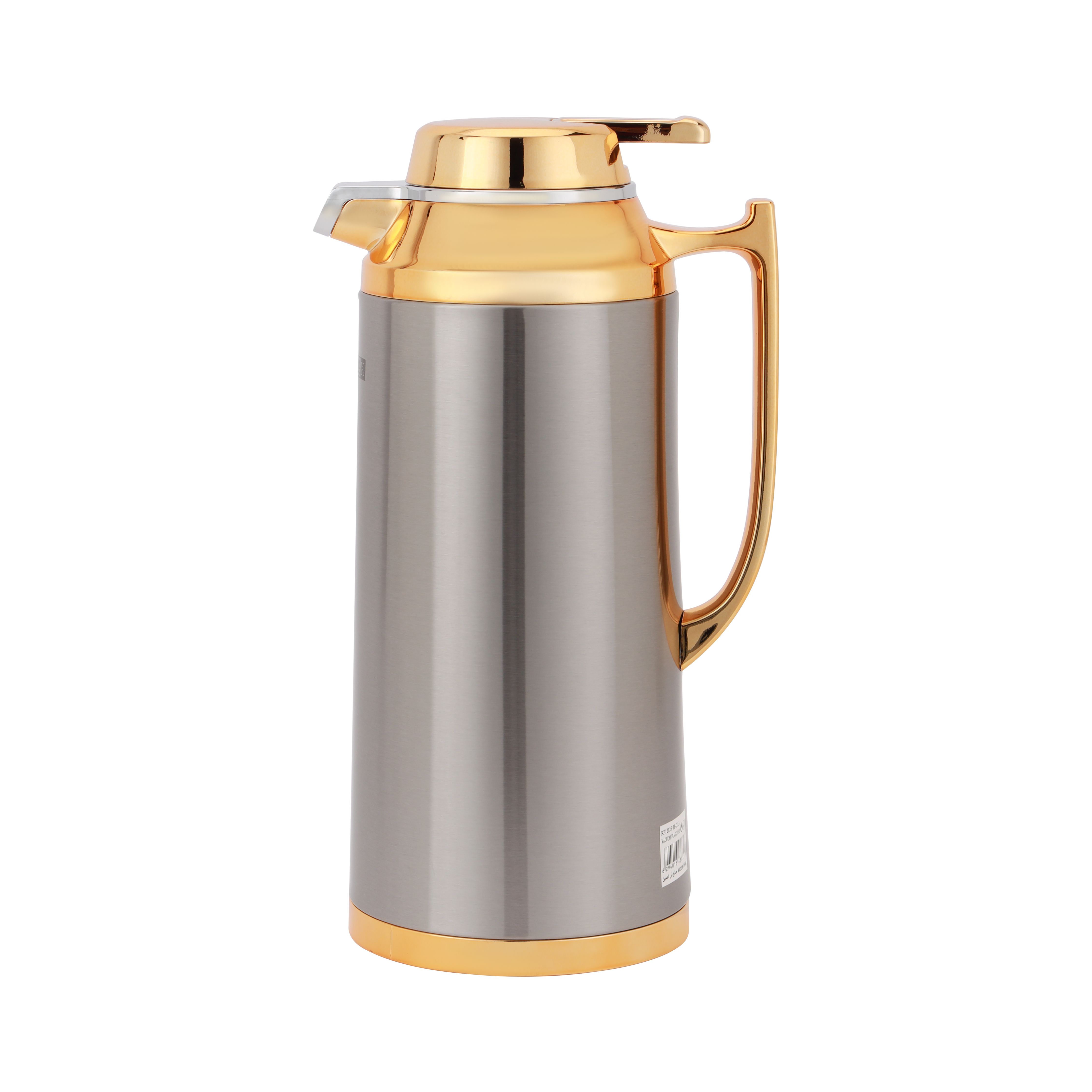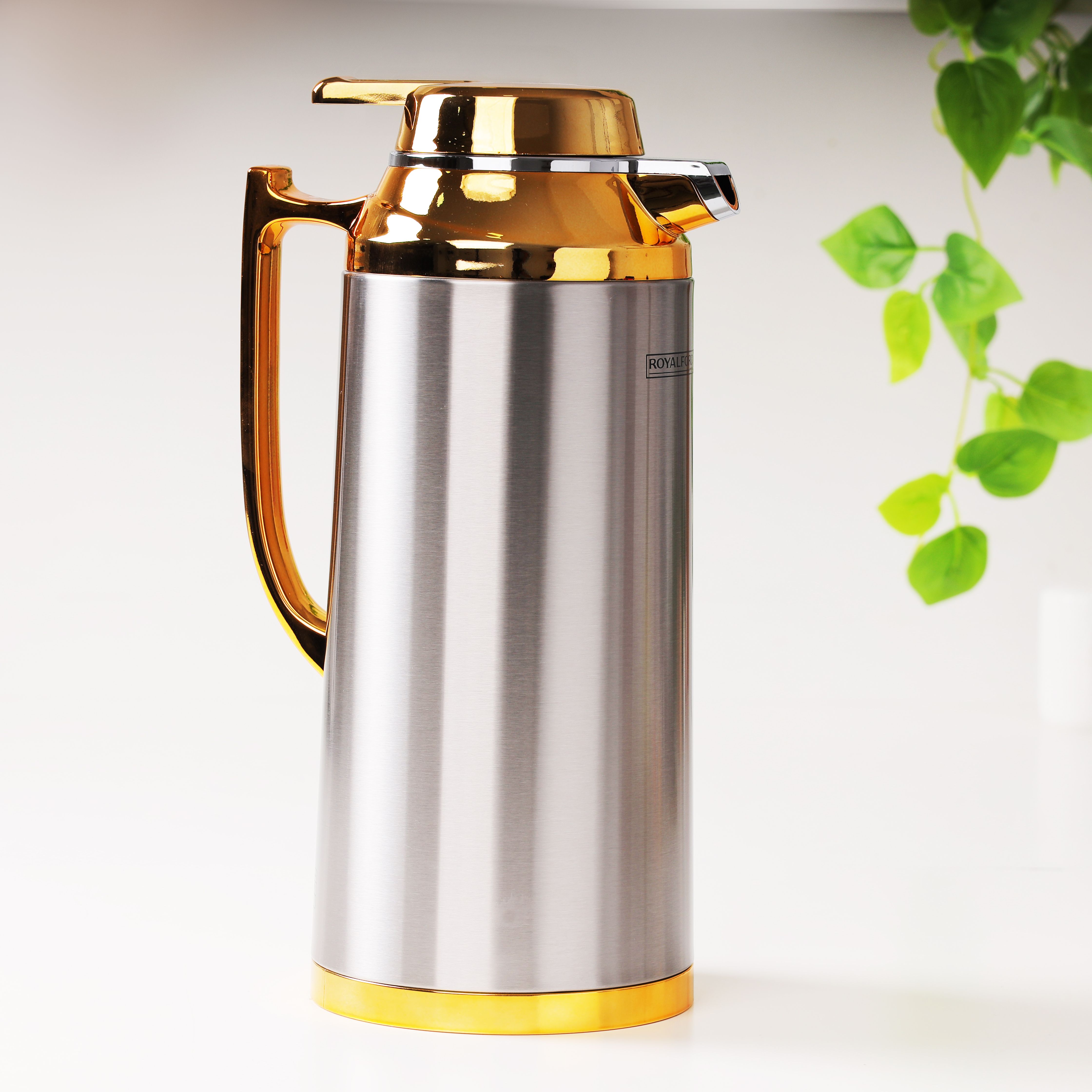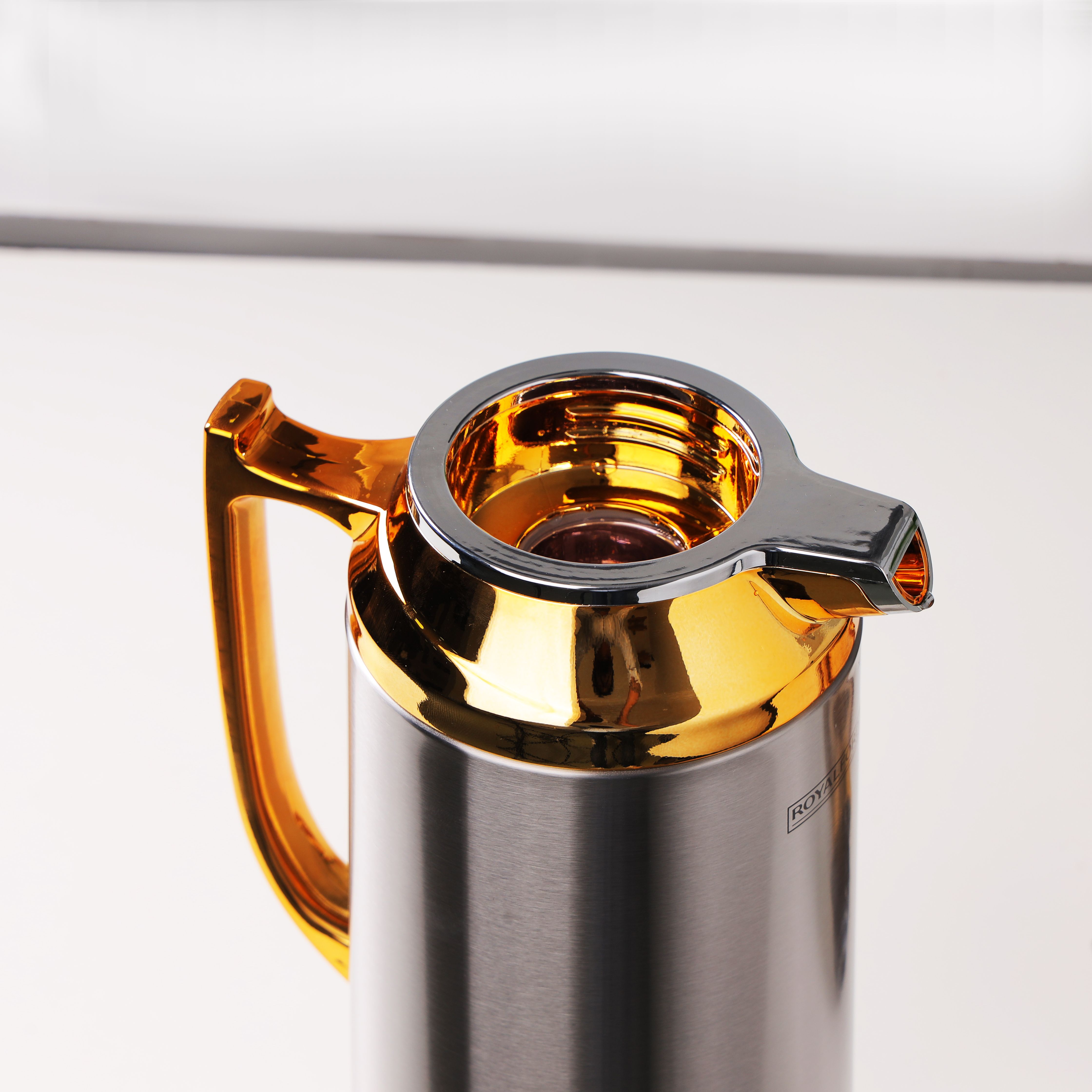 b"Your survival kit on every trip. The Royalford vacuum flask, with a sturdy and durable pink glass inner pot and a high-quality stainless steel outer body with a handle, makes it convenient for enjoying your favorite beverage anywhere. The 1.6 L (54.0 oz) flask is constructed from superior-quality materials and is 100% food-grade, asbestos-free, non-toxic, corrosion-resistant, and safe to use. It also prevents chemicals from leaching into its contents. The flask is designed to provide you with a healthy way to keep your drinks hot or cold for longer. Fill it with your favorite iced lemonade or hot coffee, or a refreshing kahwa, and relax with your family or friends. It also holds onto heat or cold, keeping your beverage at just the right temperature for a wonderful drinking experience. It is attractive and sturdy for storing water or other beverages such as tea, coffee, kahwa, juice, smoothies, milkshakes, etc. It is convenient to use at home while traveling, hiking, road-tripping, visiting hospitals, camping, etc. The vacuum flask has a durable and leak-proof lid and allows you to enjoy your drink without worrying about spillage, cracking, denting, or leaking. It is also mess-free. The lid seals strongly to preserve flavors and freshness. The pouring spout allows you to control the liquid while serving. The ergonomically designed handle provides a comfortable and firm grip. It is strong enough to withstand the contents' weight while pouring. The wide mouth makes it easy to fill and clean. Its enticing white and golden color palette makes it an attractive option for your needs. It is smart, stylish, and the right companion for your everyday life since it is crafted with food-grade materials. It is also a thoughtful choice for gifting to your loved ones."