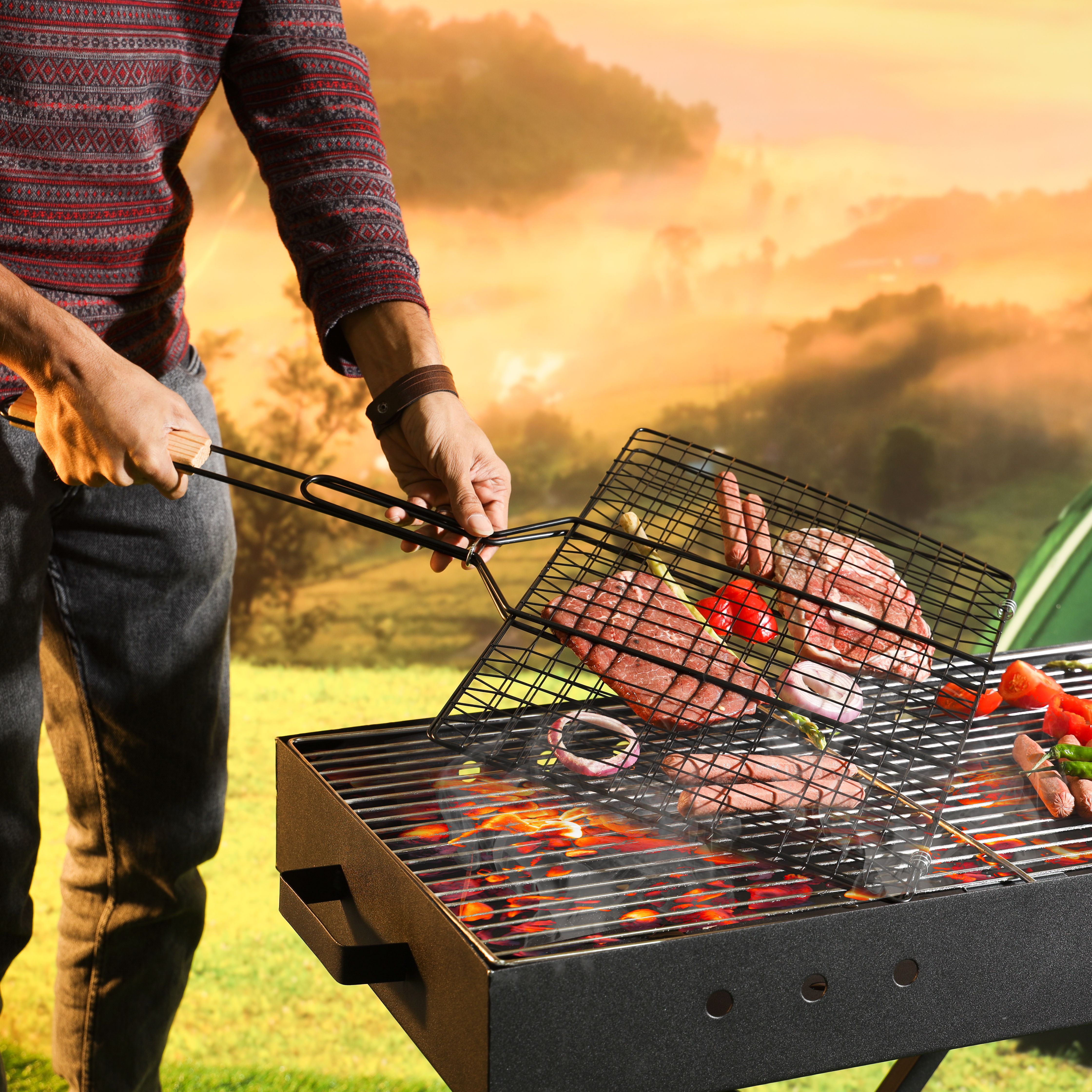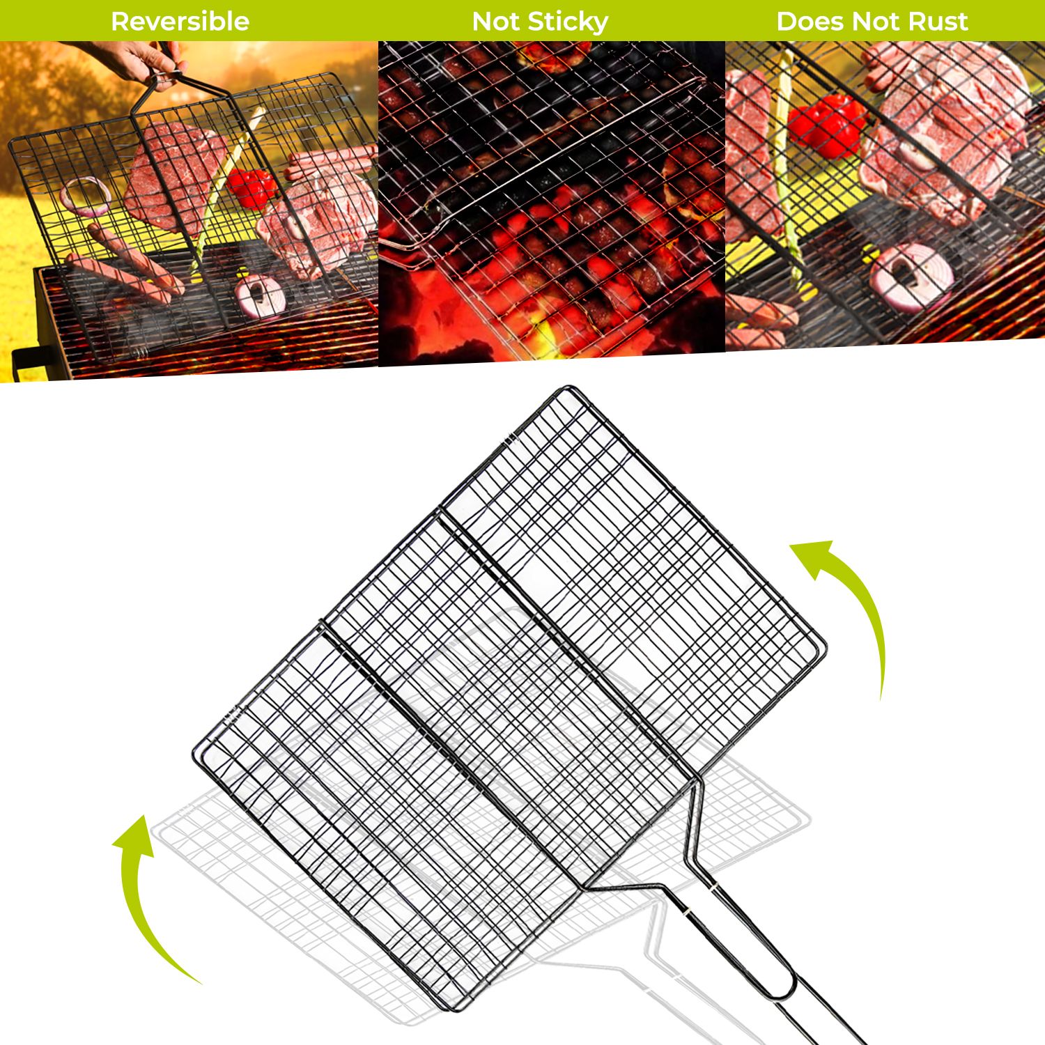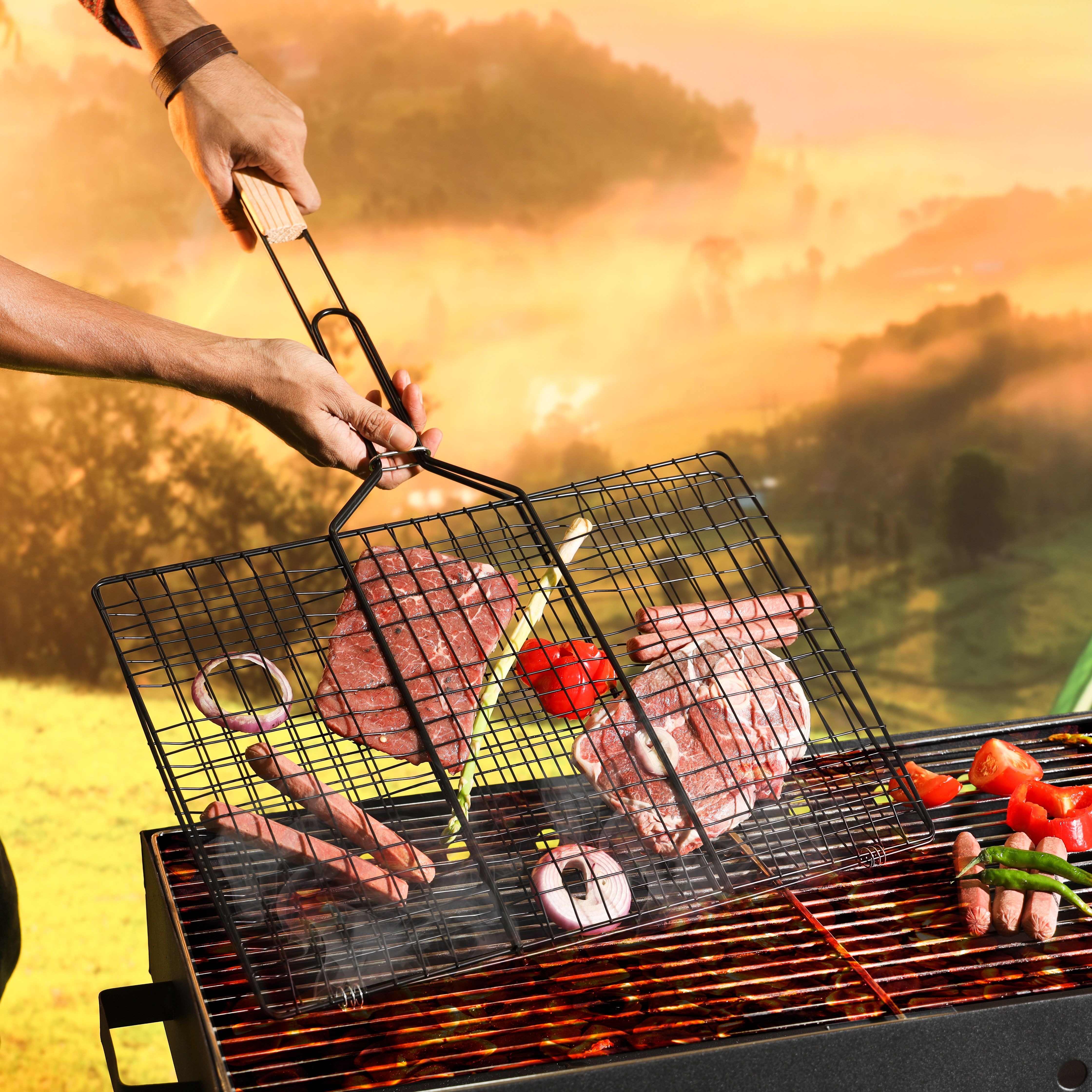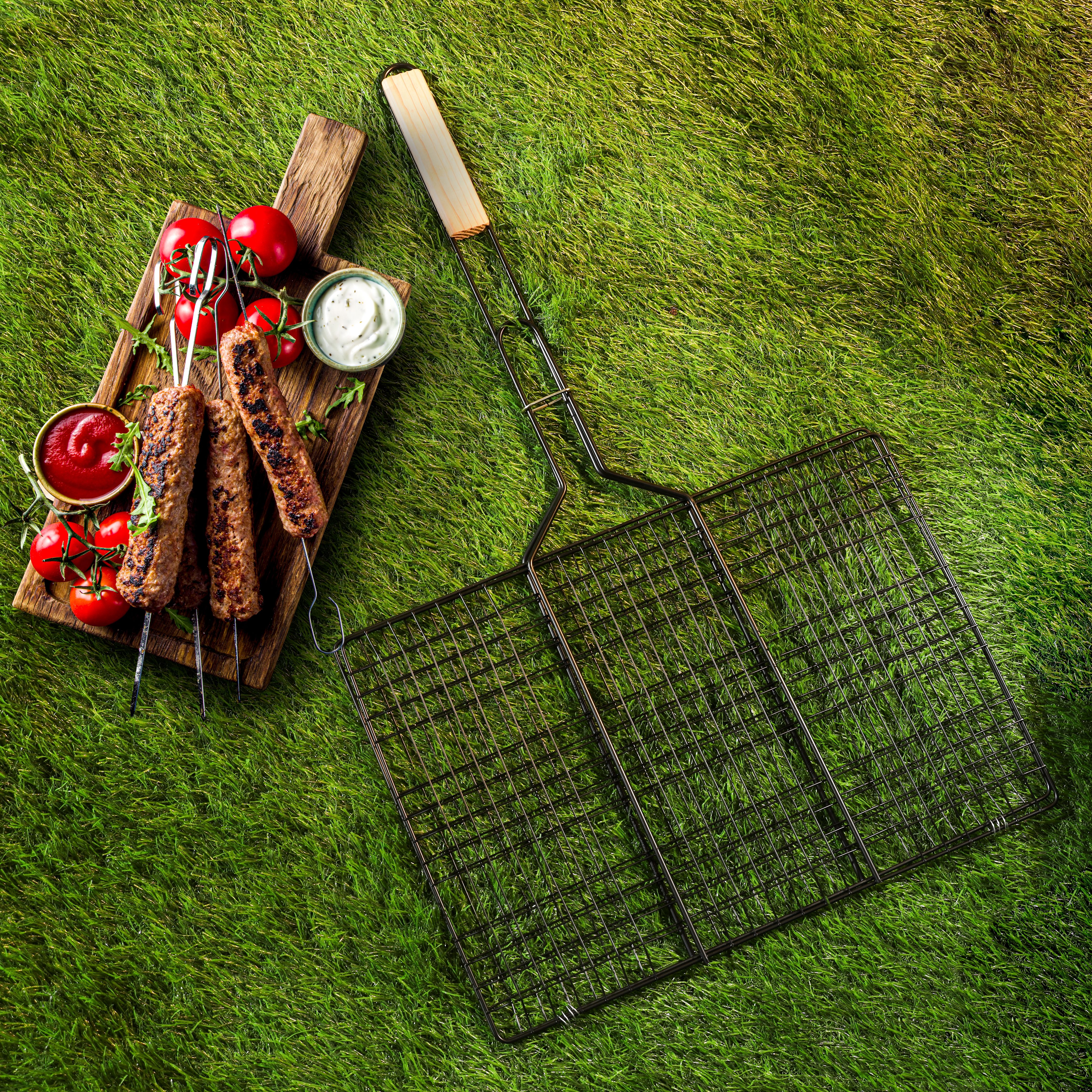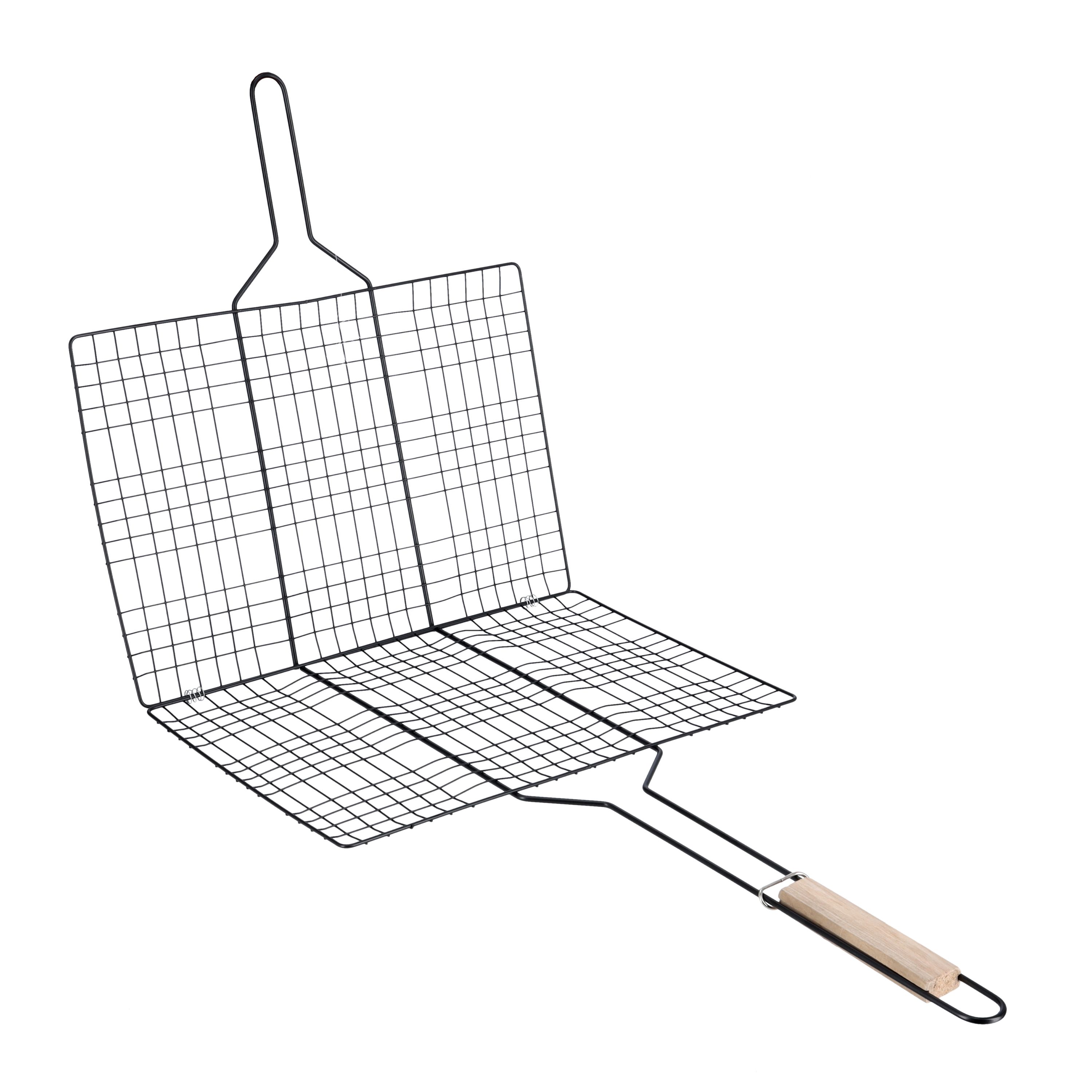 Royalford Barbeque Grill Chromium Plated Iron RF10374 - Wooden Handle, Folding Portable BBQ Grill Basket for Fish Vegetables Shrimp Larger Grilling Area