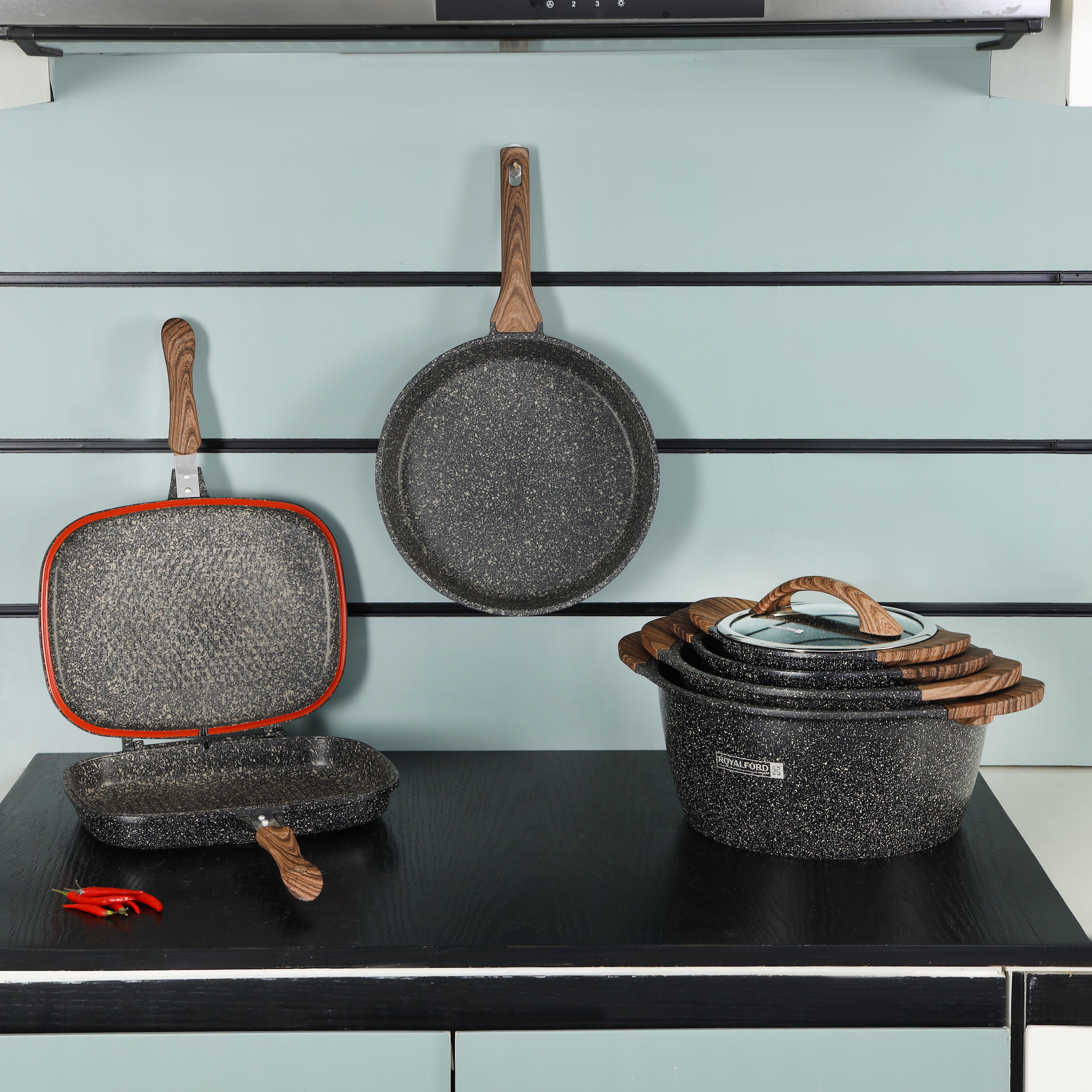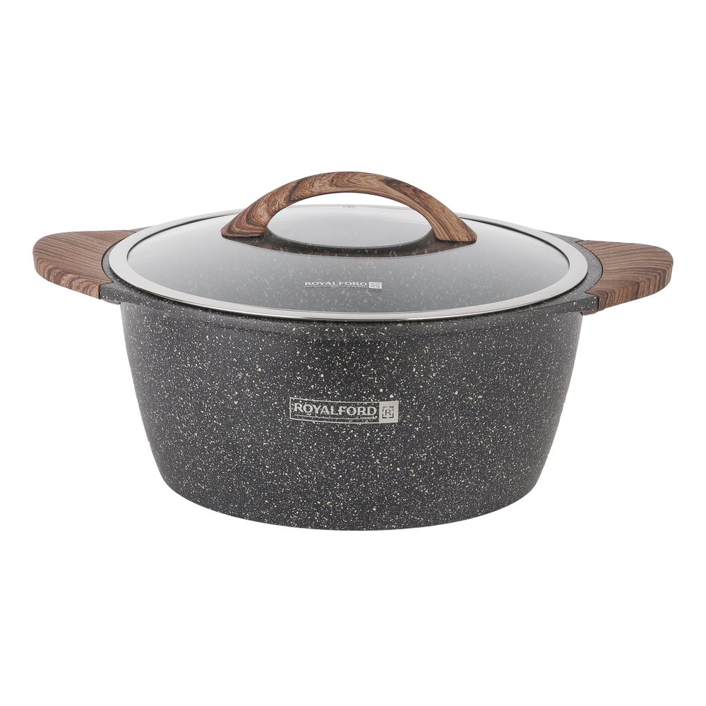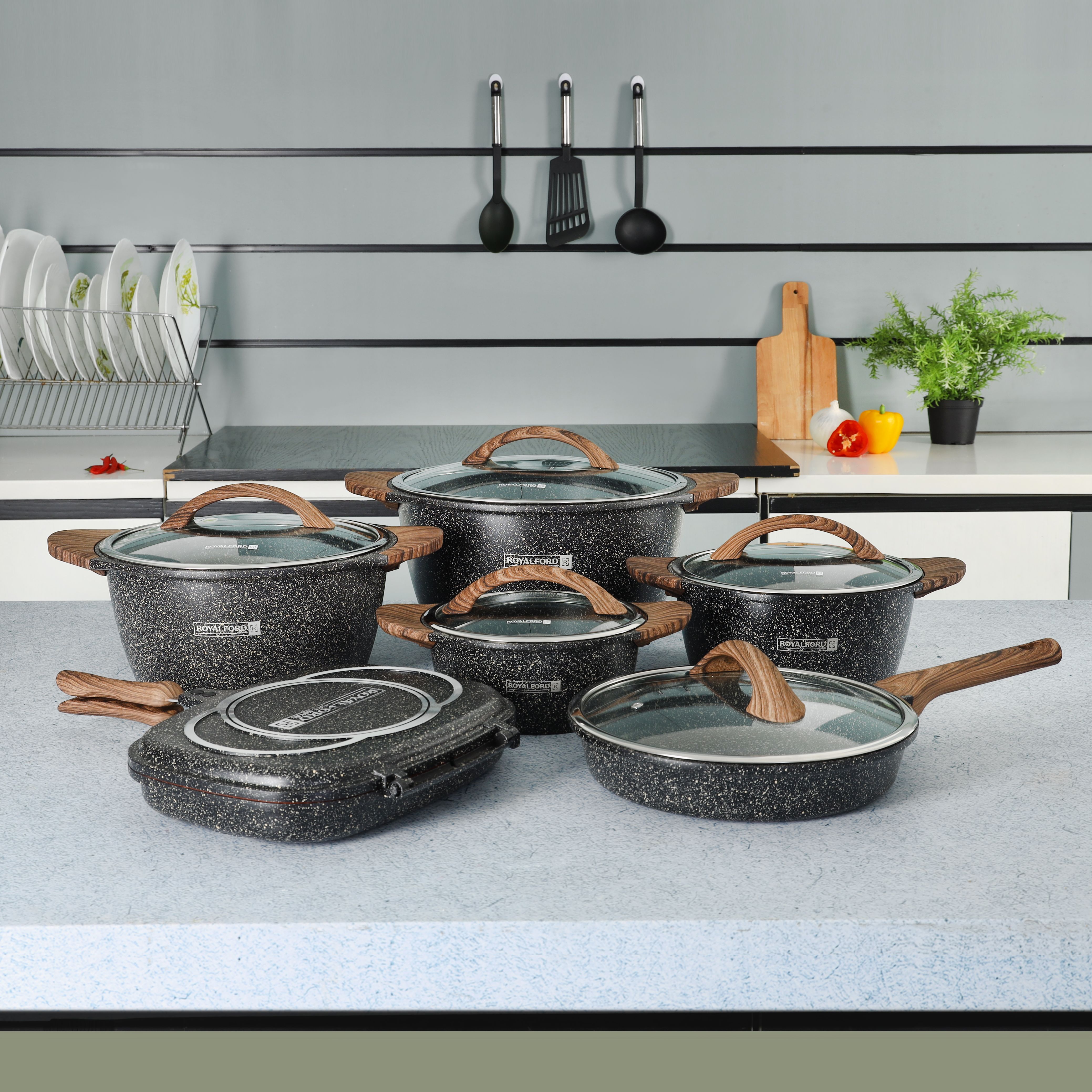 Royalford Granoware 12-Piece Cookware Set- RF11737| Die Cast Aluminum with Granite Coated Body| Induction Base, Wooden Finish Bakelite Handles and Tempered Glass Lid| Includes Casseroles, Grill pan, and Fry Pan| Blue
