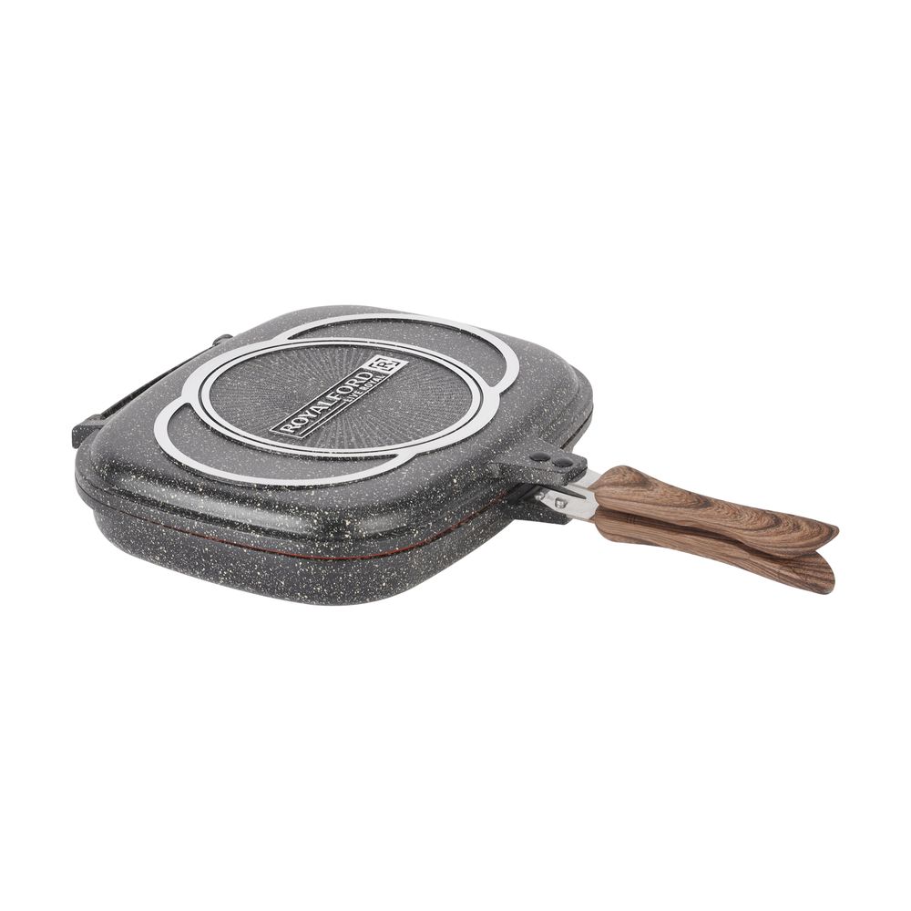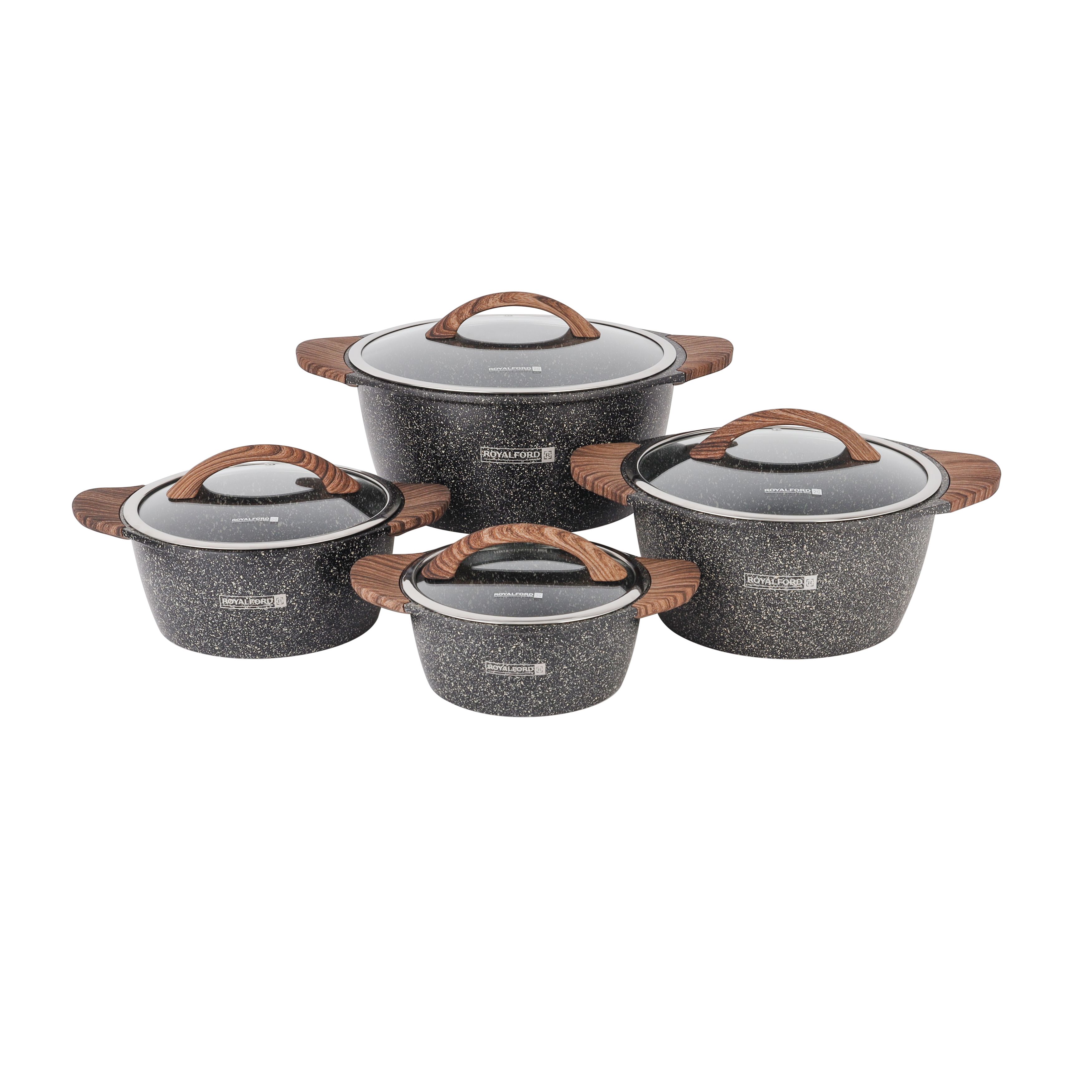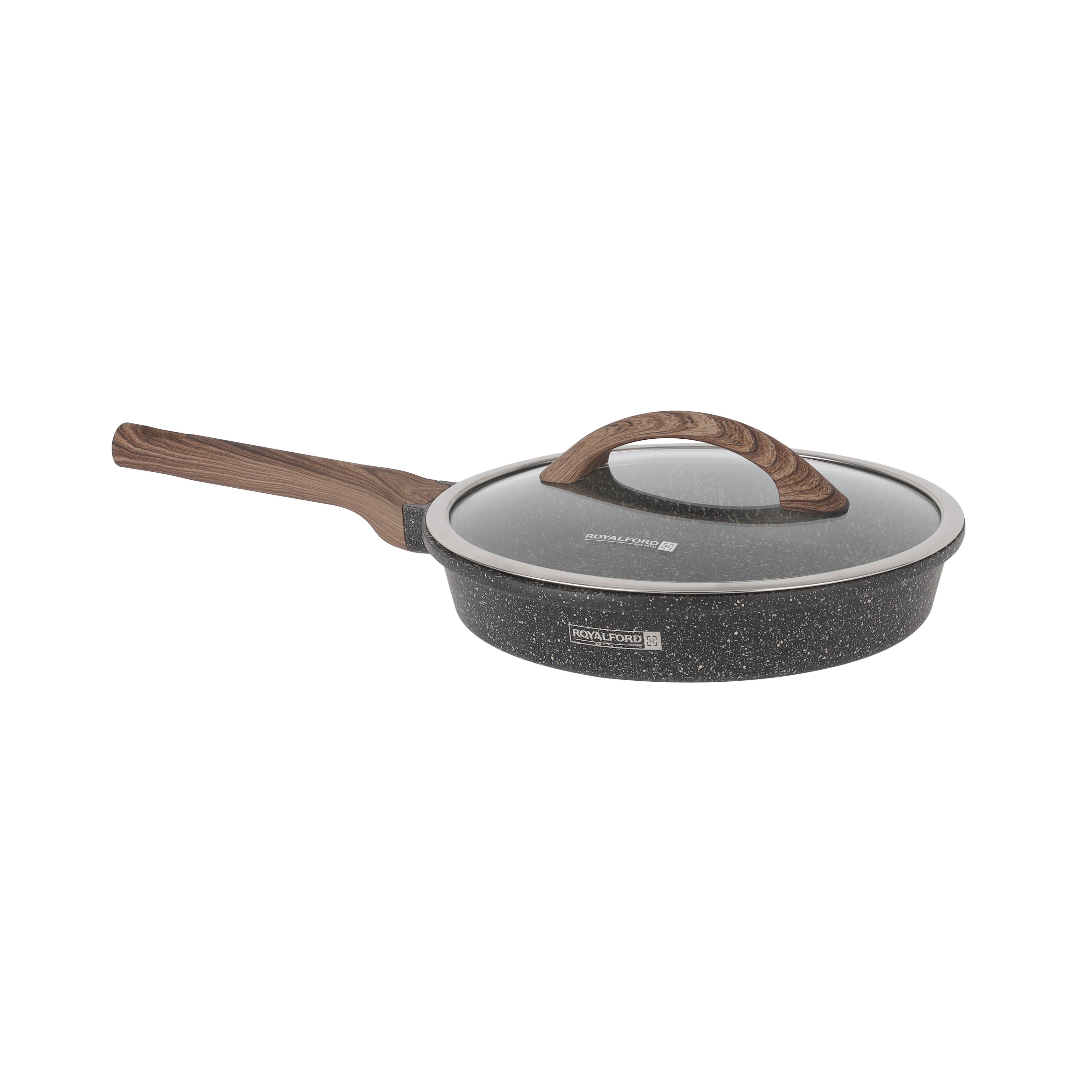 Royalford Granoware 12-Piece Cookware Set- RF11737| Die Cast Aluminum with Granite Coated Body| Induction Base, Wooden Finish Bakelite Handles and Tempered Glass Lid| Includes Casseroles, Grill pan, and Fry Pan| Blue