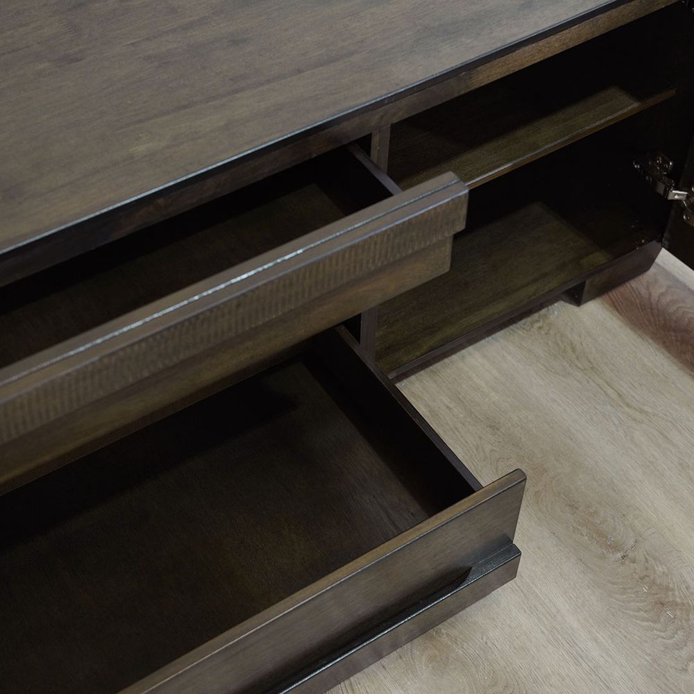 يتميز بتصميم مستطيل مزود بخزانتين مغلقتين ودرجين لتخزين وحدات الوسائط الصغيرة وملحقاتها دون فوضى.