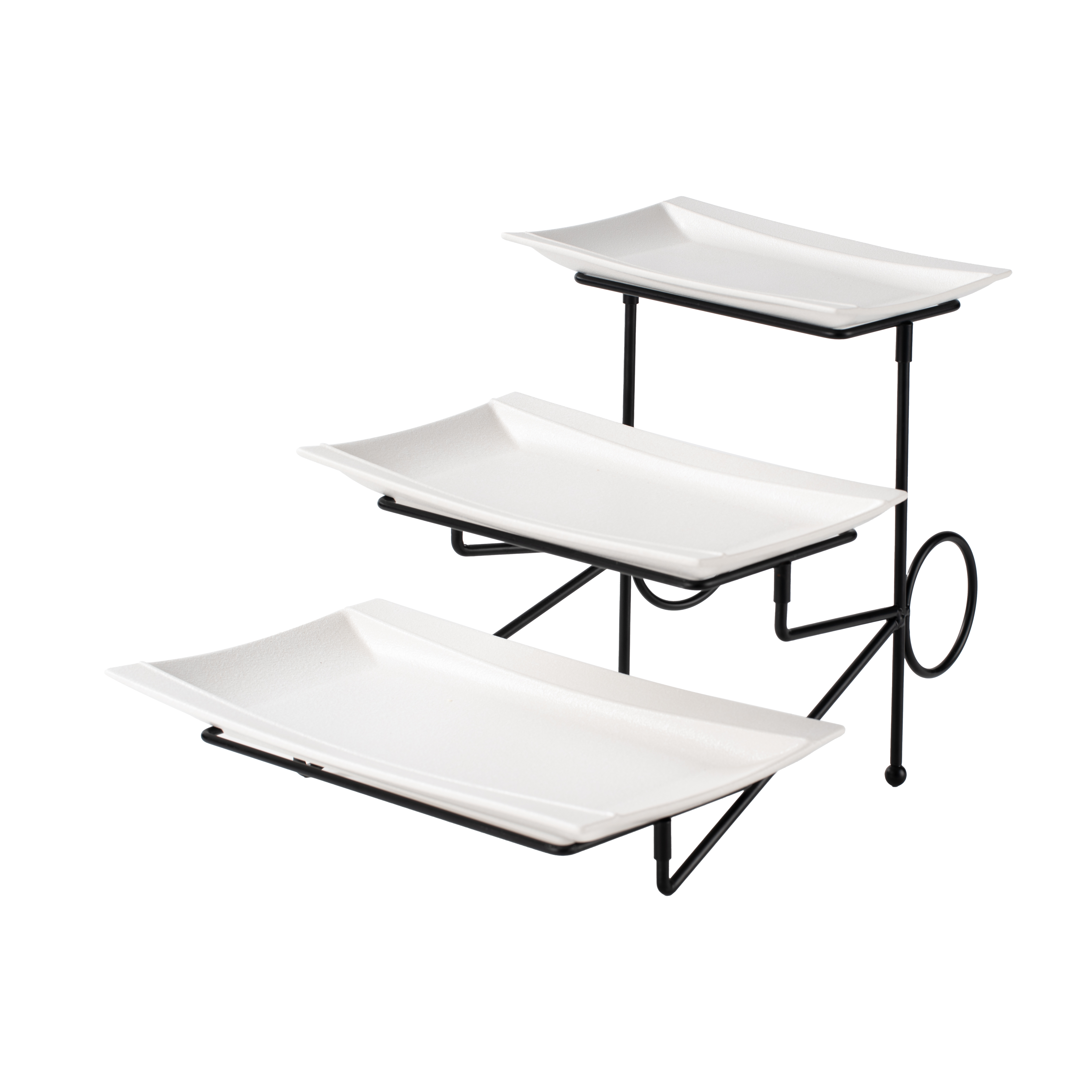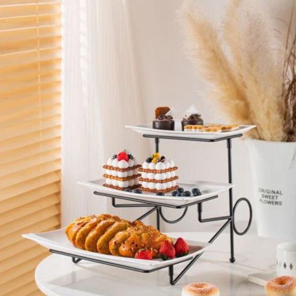 Shallow Elegant Porcelain 3 Tier White Plate with Black Stand (Small Plate 23cm, Mid Plate 28cm, Large Plate 33cm)