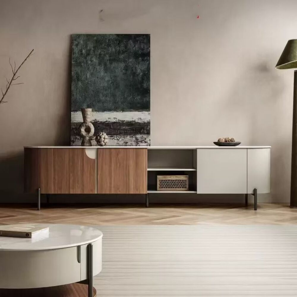 TV table with rounded edges, designed to soften the sharp lines of traditional rectangular shapes. The contrast between the rich dark walnut wood and the refined earthy gray tone creates a stunning visual balance — a hallmark of modern interior design.