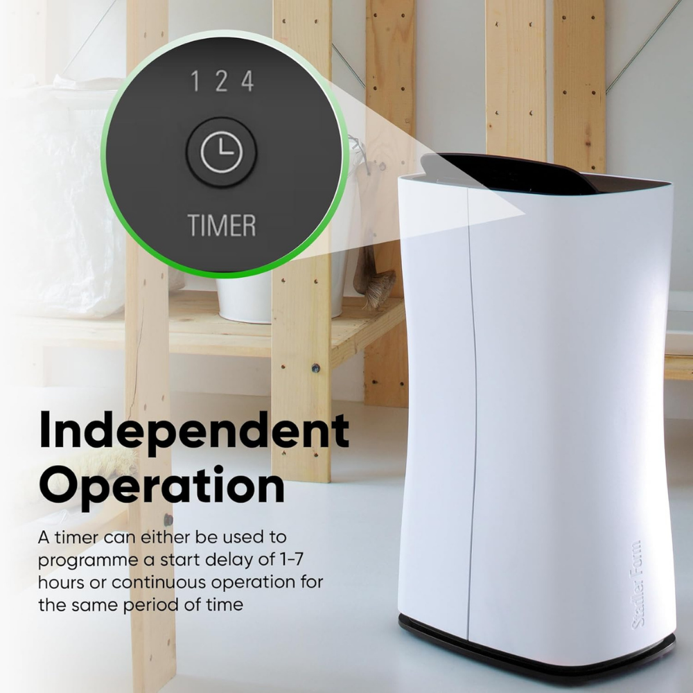 An integrated hygrostat means the desired humidity can be set to 40%, 50% or 60%. Alternatively, Theo can run continuously.