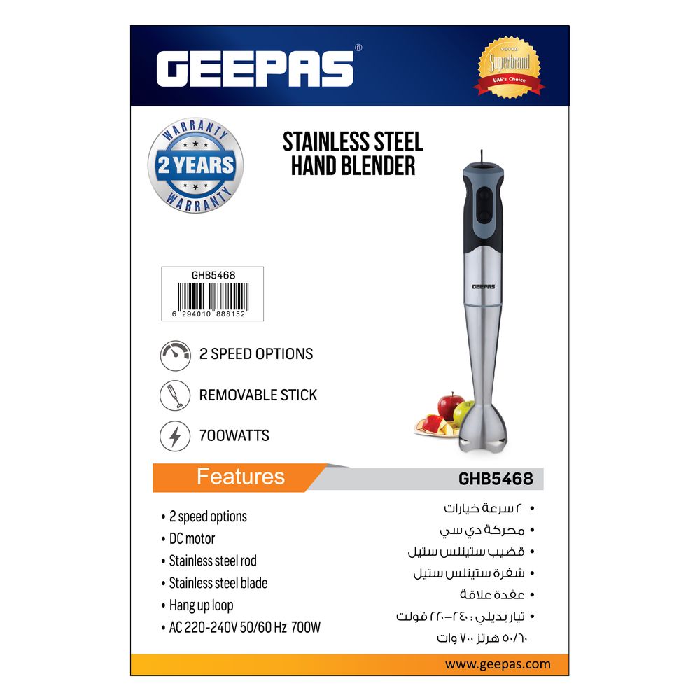 Geepas Stainless Steel Hand Blender - 2 Speed Powerful Motor with Durable Stainless Steel Blade & Removable Stick | Ideal for Smoothies, Shakes, Baby Food, & Fruits GHB5468 Silver/Black
