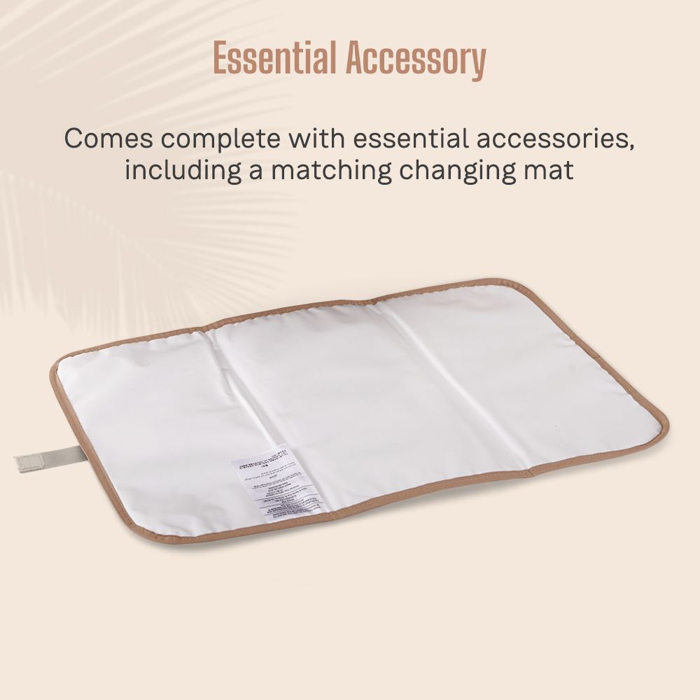 Inside, the bag features 5 smart compartments and 6 internal pockets, including a dedicated laptop/tablet sleeve (34.5cm × 26cm), an insulated pocket to keep bottles warm or cool, and a wet/dry separation pocket for hygiene essentials. The included changing mat makes diaper changes on the move stress-free, while the stroller straps let you attach the bag hands-free for added convenience.