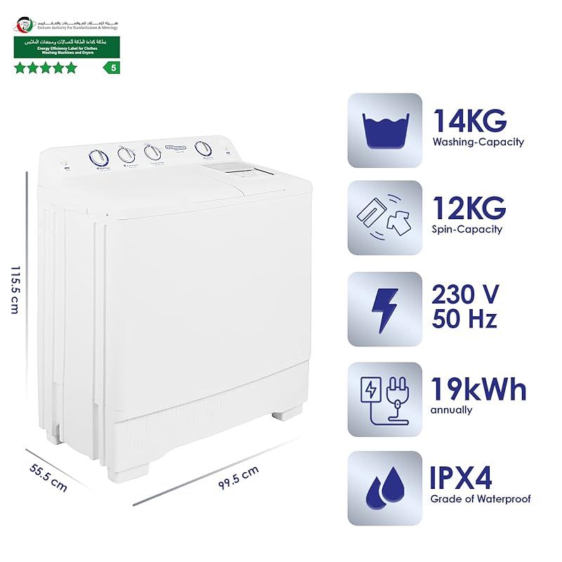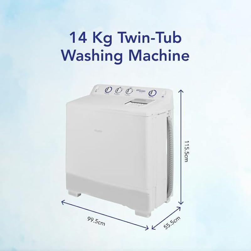 Super General 14 kg Twin-tub Semi-Automatic Washing Machine, White, efficient Top-Load Washer with Lint Filter, Spin-Dry, SGW-150-N, 99.5 x 55.5 x 115.5 cm, 1 Year Warranty