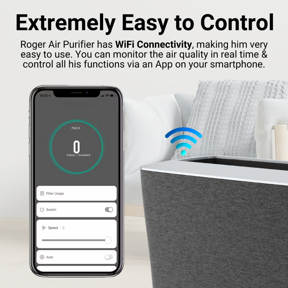 APP CONTROL: Roger air purifier features Wi-Fi connectivity, allowing you to monitor and control it in real time through the smartphone app. The app also includes a child lock for added safety
