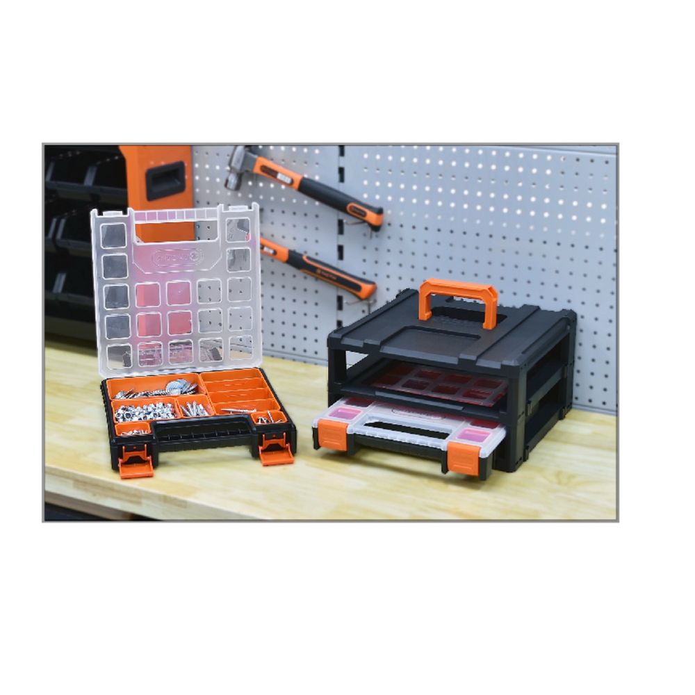 Built for durability and convenience, this compact tool storage system measures 33.1 cm wide, 32.1 cm deep, and 18.4 cm high, making it space-saving yet spacious. The clear plastic lids provide a quick view of contents, eliminating the need to open each bin. Its lightweight, portable design allows for easy transport, making it ideal for mobile contractors, mechanics, and home improvement enthusiasts.
