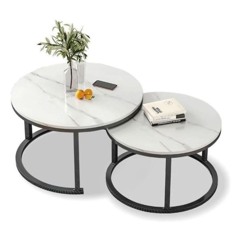Tissaya Round Nesting Coffee Table Set of 2 End Tables for Living Room, Metal Frame, Center Table for Home Office (Marbel Top White)