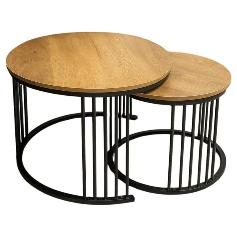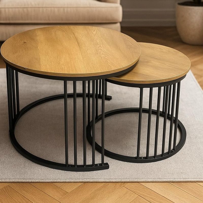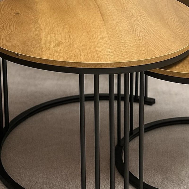 Tissaya Round Nesting Coffee Table Set of 2 End Tables for Living Room, Metal Frame, Center Table for Home Office (Wooden Top Light-Oak)