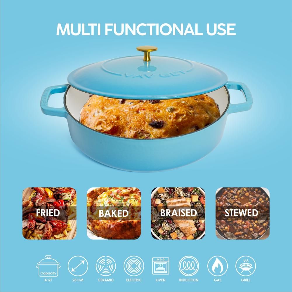 The VAV GET Enameled Cast Iron Dutch Oven Braiser 28cm is designed for slow, low-heat cooking, making it perfect for tenderizing vegetables and creating rich, flavorful meat stews. It also provides the ideal heat distribution for baking no-knead bread. Compatible with gas, ceramic, electric, and induction cooktops, this versatile casserole dish is a must-have for every home kitchen.
