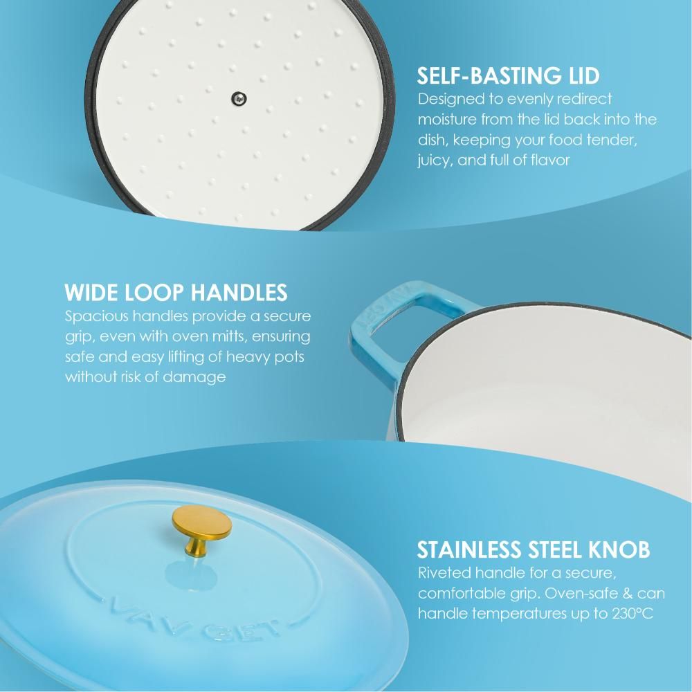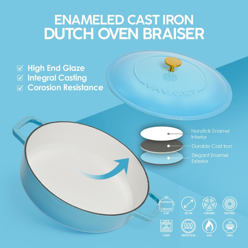 • TIMELESS KITCHEN ESSENTIAL – The VAV GET Enameled Cast Iron Dutch Oven Braiser is crafted with premium enameled cast iron, ensuring excellent heat distribution and superior heat retention. Its durable construction allows for even cooking on all stovetops, including gas, ceramic, electric, and induction, as well as in the oven or on the grill.