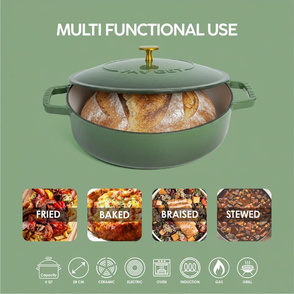 The VAV GET Enameled Cast Iron Dutch Oven Braiser 28cm is designed for slow, low-heat cooking, making it perfect for tenderizing vegetables and creating rich, flavorful meat stews. It also provides the ideal heat distribution for baking no-knead bread. Compatible with gas, ceramic, electric, and induction cooktops, this versatile casserole dish is a must-have for every home kitchen.