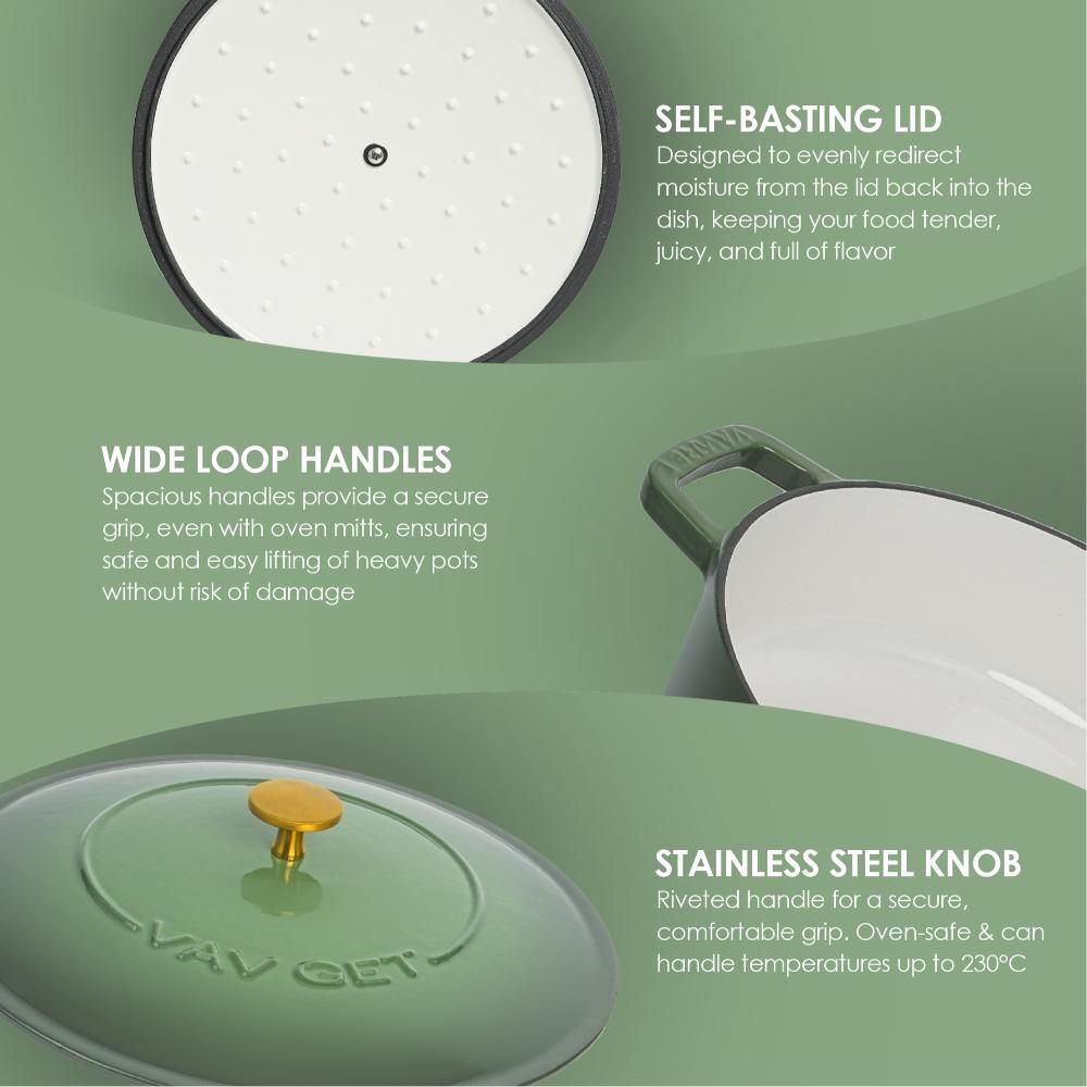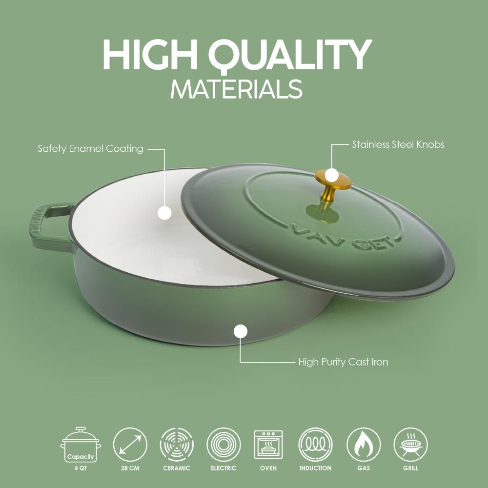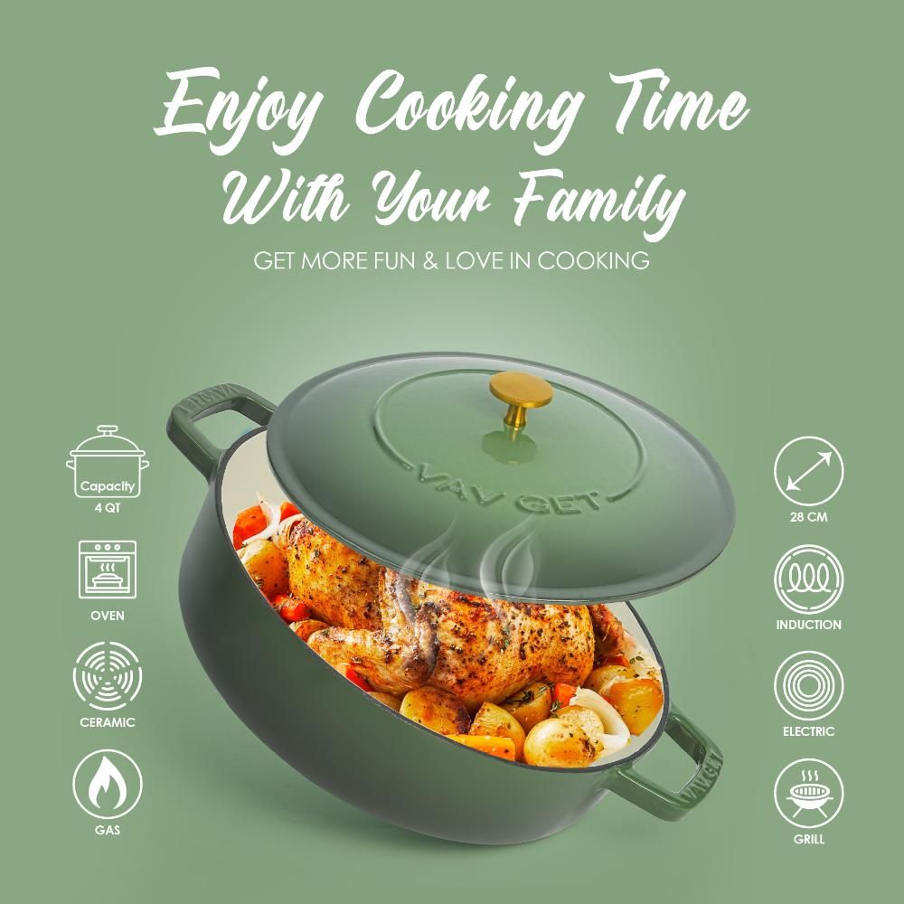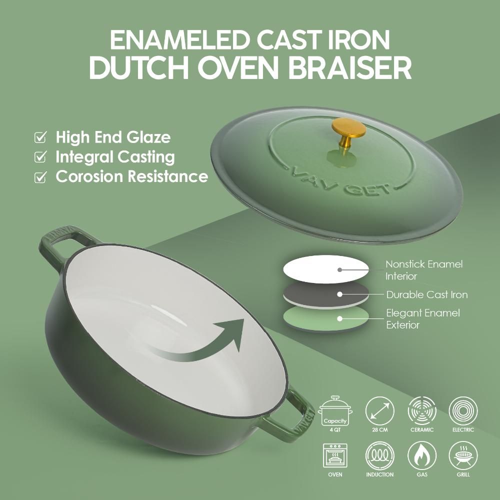 • TIMELESS KITCHEN ESSENTIAL – The VAV GET Enameled Cast Iron Dutch Oven Braiser is crafted with premium enameled cast iron, ensuring excellent heat distribution and superior heat retention. Its durable construction allows for even cooking on all stovetops, including gas, ceramic, electric, and induction, as well as in the oven or on the grill.