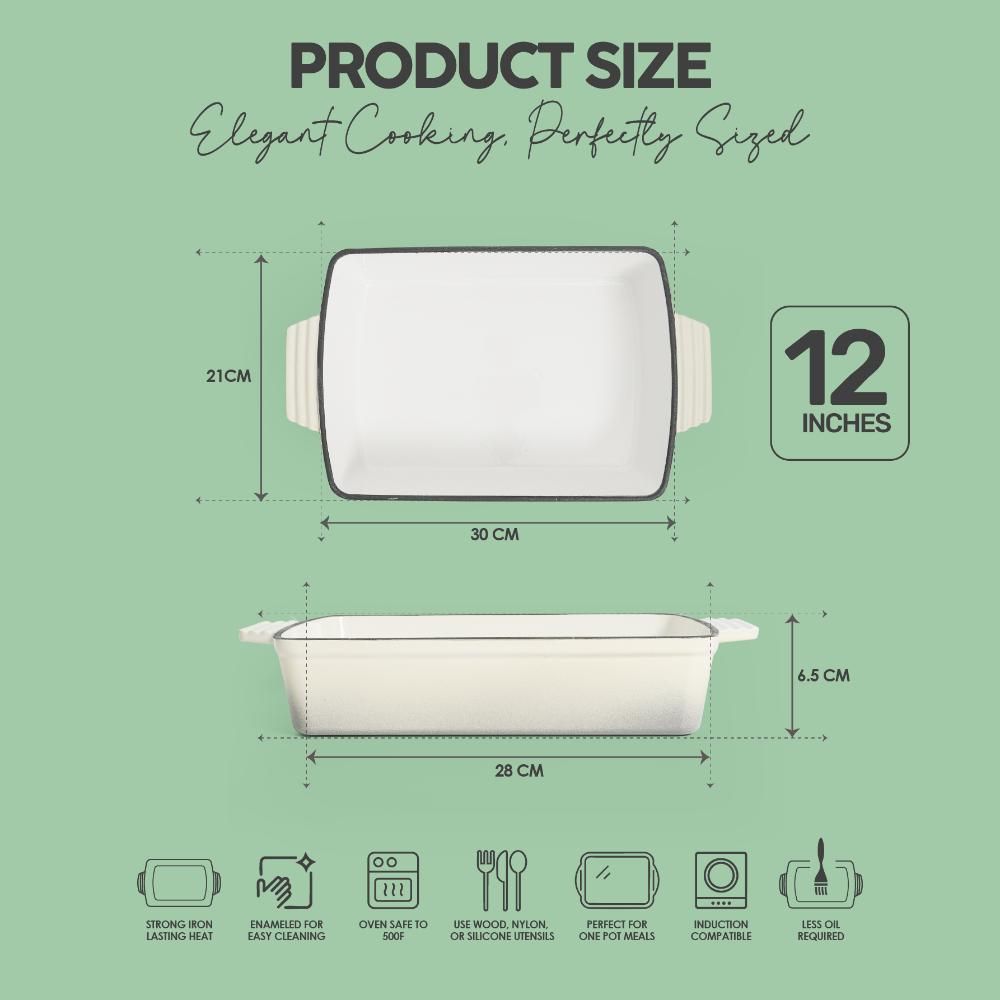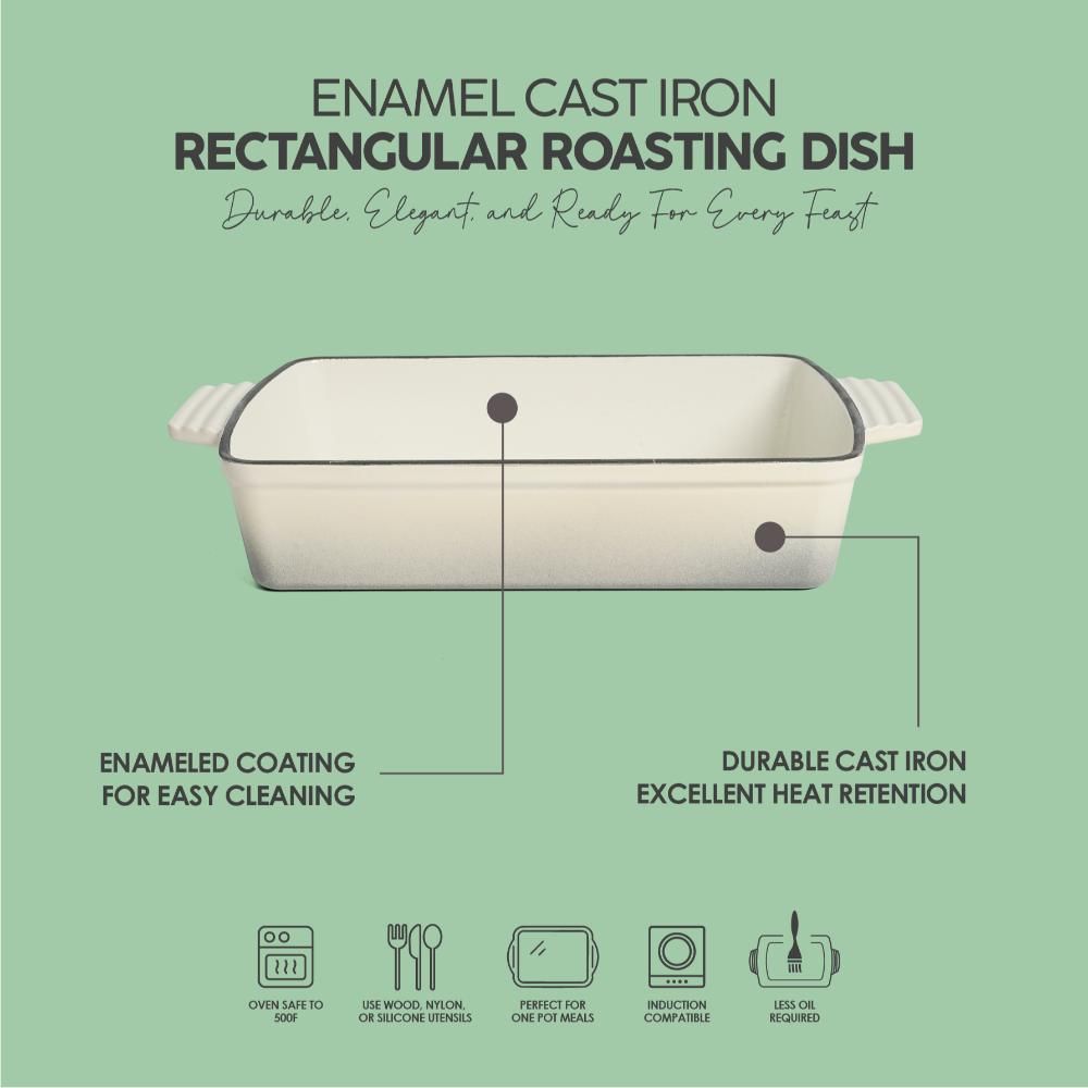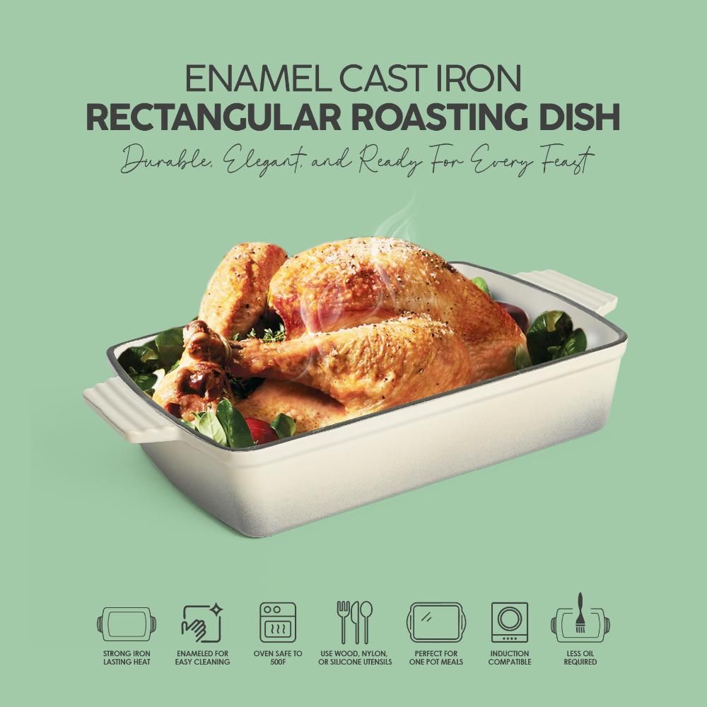 Healthy & Safe Enamel Cast Iron Rectangular Roasting Dish, (12-Inch, Cream) Oven & Induction Compatible, Easy-Clean Non-Stick Interior