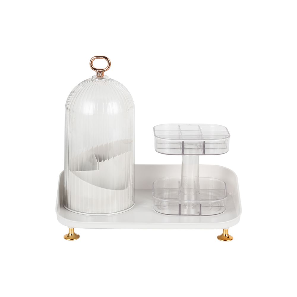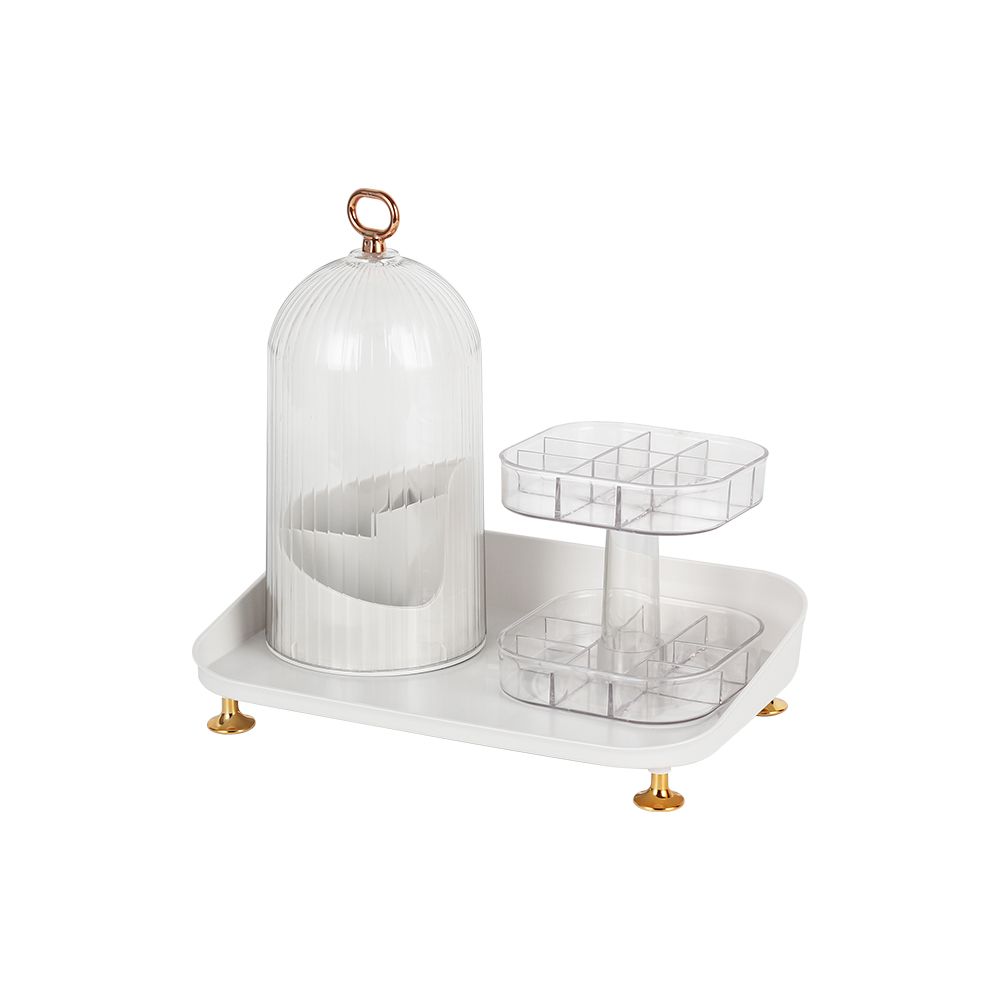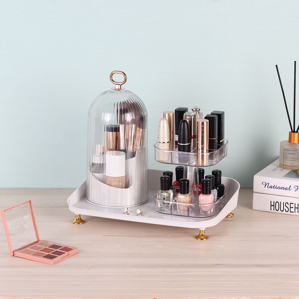 Add a touch of elegance to your vanity with this luxury organizer set, featuring a transparent dome cover and a two-tier display stand. Perfect for storing lipsticks, perfumes, and brushes, it combines functionality with a sophisticated design—ideal for modern dressing tables and bathroom counters.