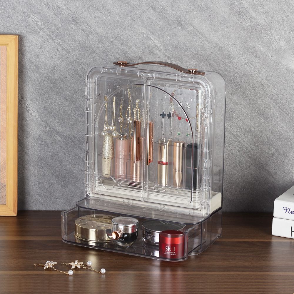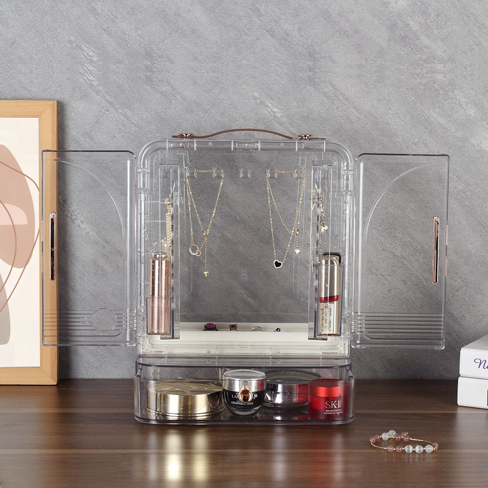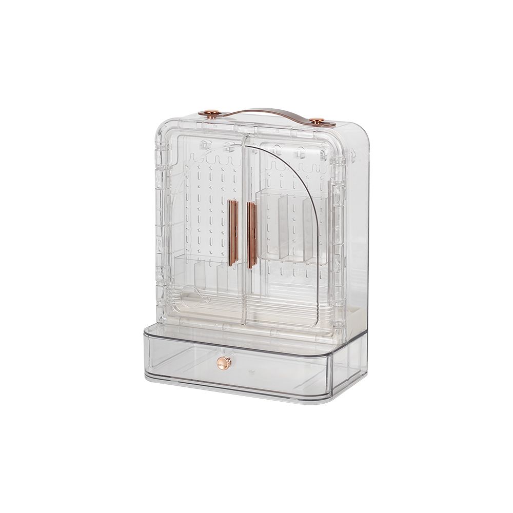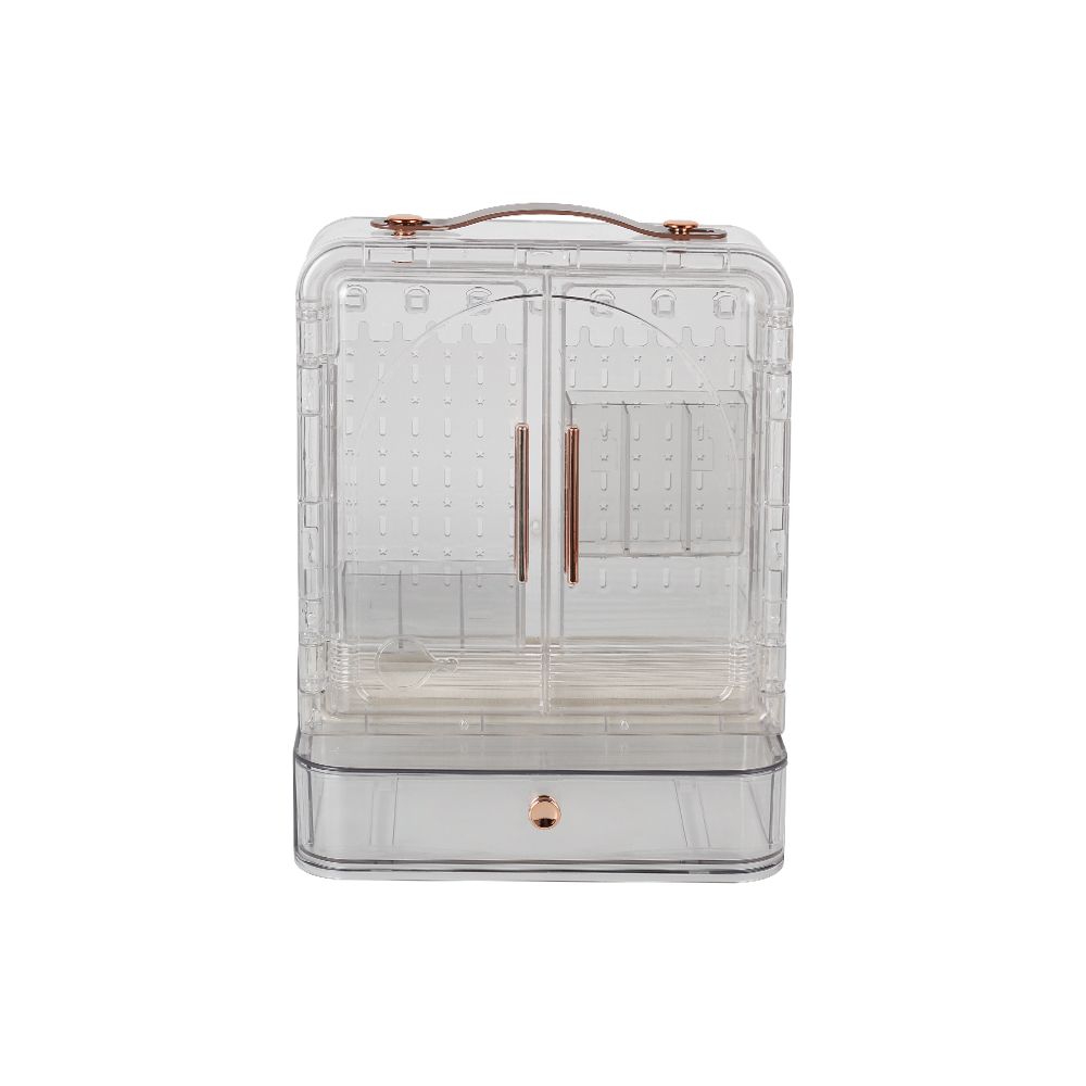 Add a touch of sophistication to your vanity with this luxury transparent makeup and jewelry organizer. Designed with multiple compartments for brushes, lipsticks, and accessories, it also features hanging slots for earrings and a bottom drawer for extra storage. The golden accents and handle give it a premium, modern finish—perfect for stylish dressing tables.