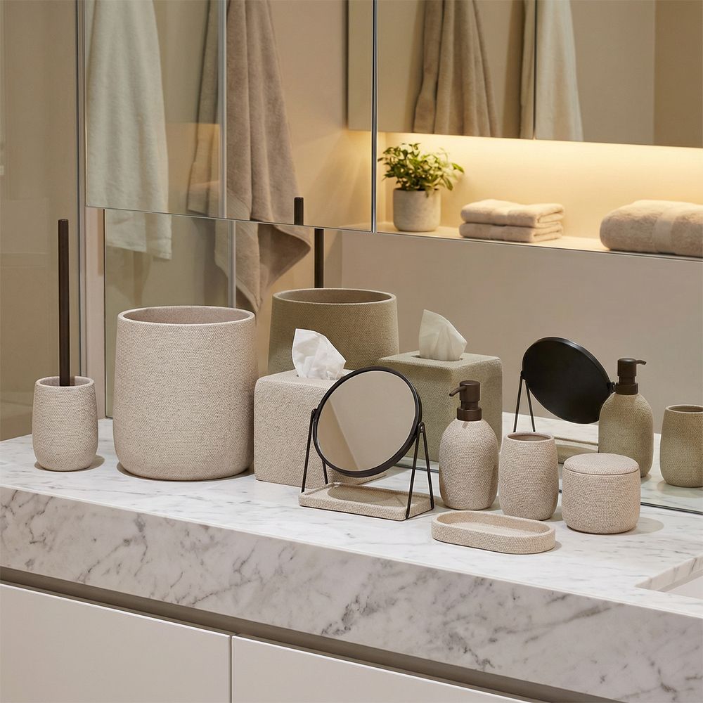 Complements matching stone-effect bathroom accessories.