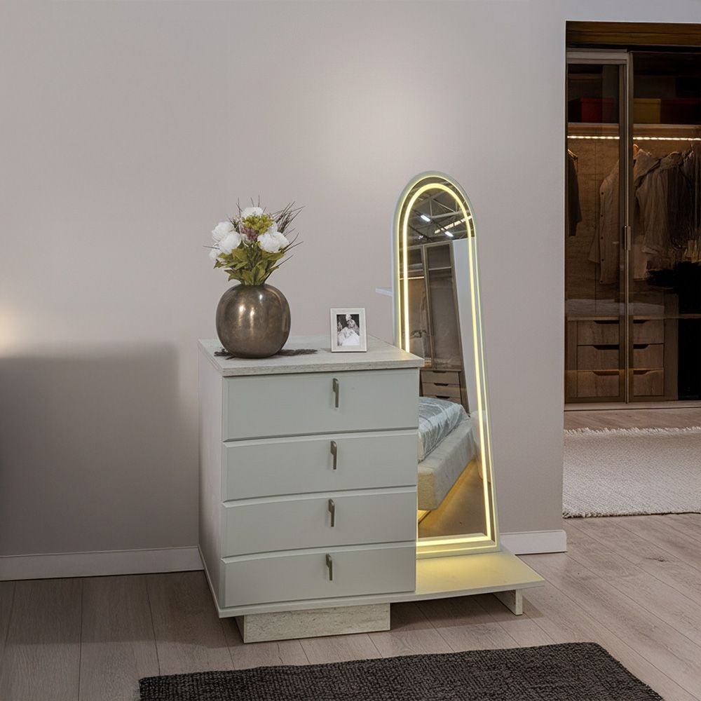 Vesta 4 Drawer Dresser With Tall Mirror Led And Stool - Beige