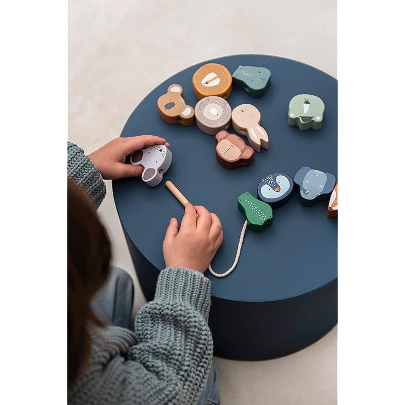 Twelve wooden animals to thread on a string using a needle to train little fingers