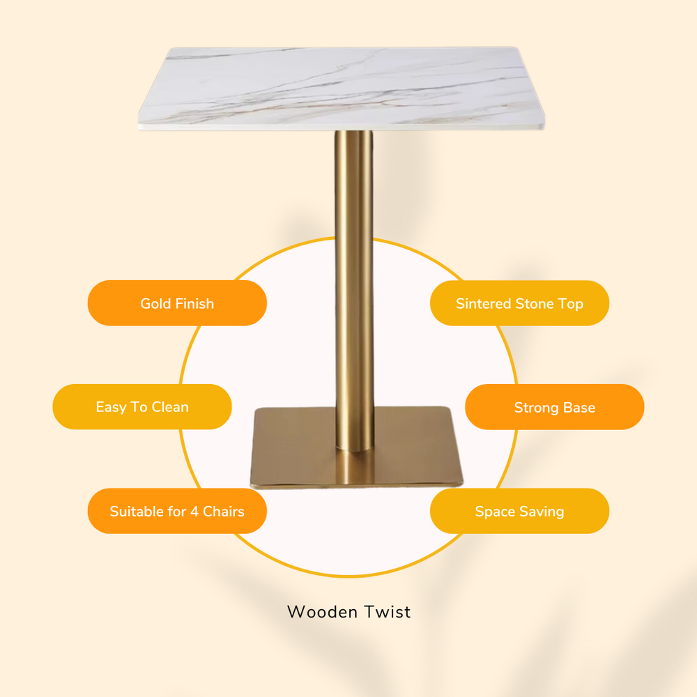 Elevate your dining experience with our exquisite Wooden Twist Bourgeois Square Dining Table. Crafted with precision, this table boasts a stunning combination of a base, a luxurious marble top, and a durable metallic base. Its unique design seamlessly blends rustic charm with modern elegance, making it the perfect centerpiece for any cafe or restaurant.