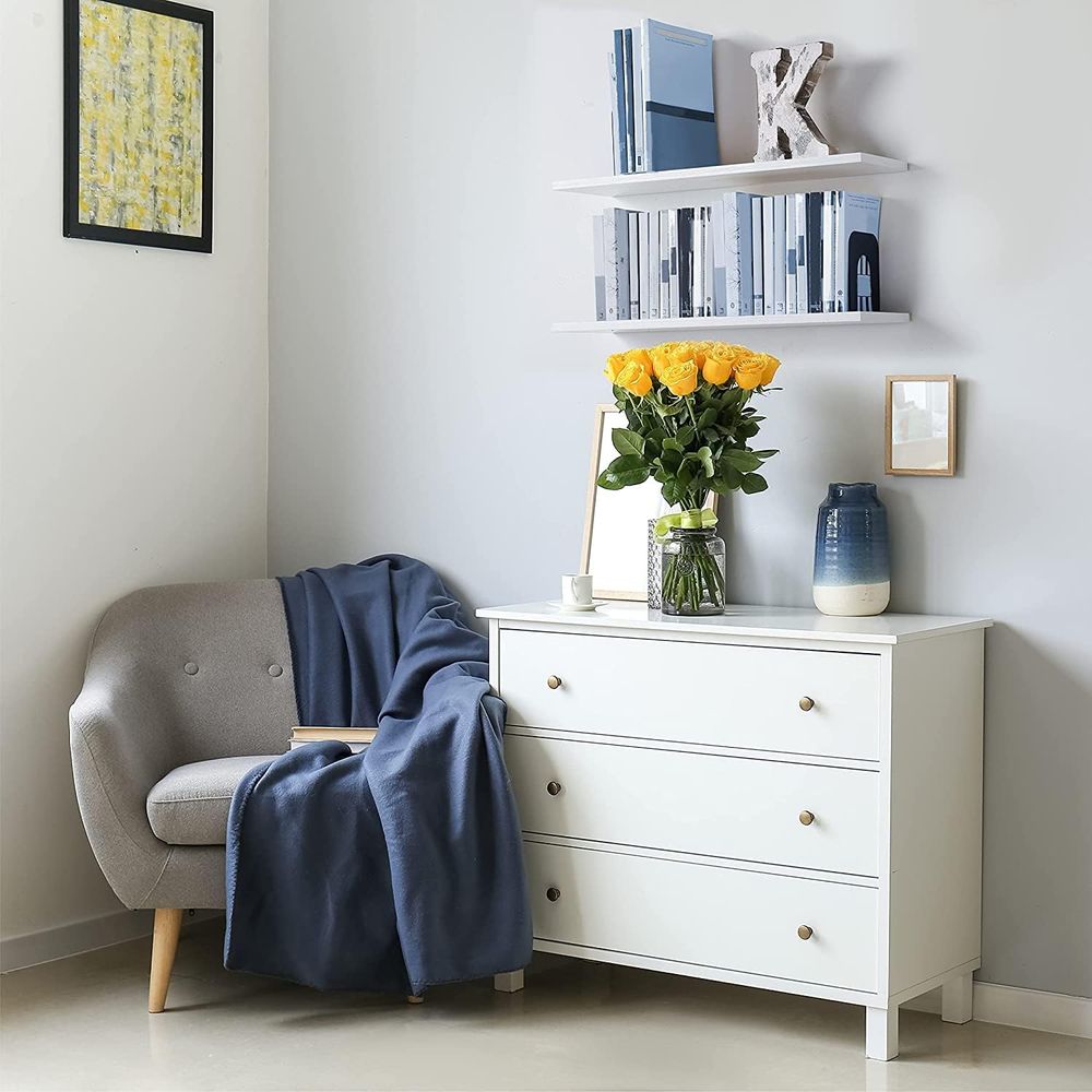 Simple and Modern Design: Set of 2 wall-mounted floating shelves with simple and modern design, made of premium MDF, coated by eco-friendly finish. Available in many sizes and colors Easy To Install: The white floating shelves set includes mounting hardware and step-by-step instructions, installation can be completed quite quickly. The wall shelf gives an actual floating look as no supports are visible once you finish the installation.You can combine the shelves to different location and latitudes as you like.
