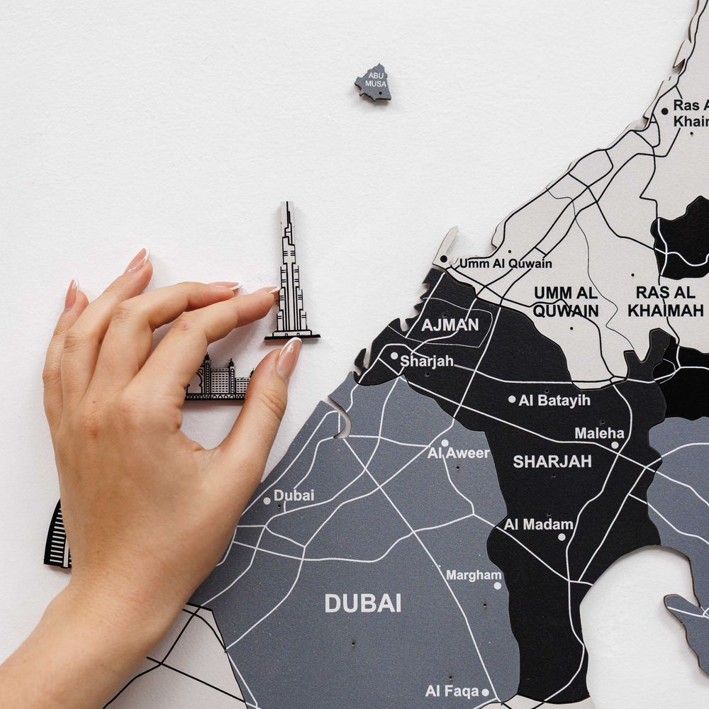 Please Note: This map is designed for decorative purposes and may not provide precise geographical accuracy of the UAE. Each map is a unique masterpiece, showcasing natural variations in wood grain and color that enhance its character and individuality 🌲.