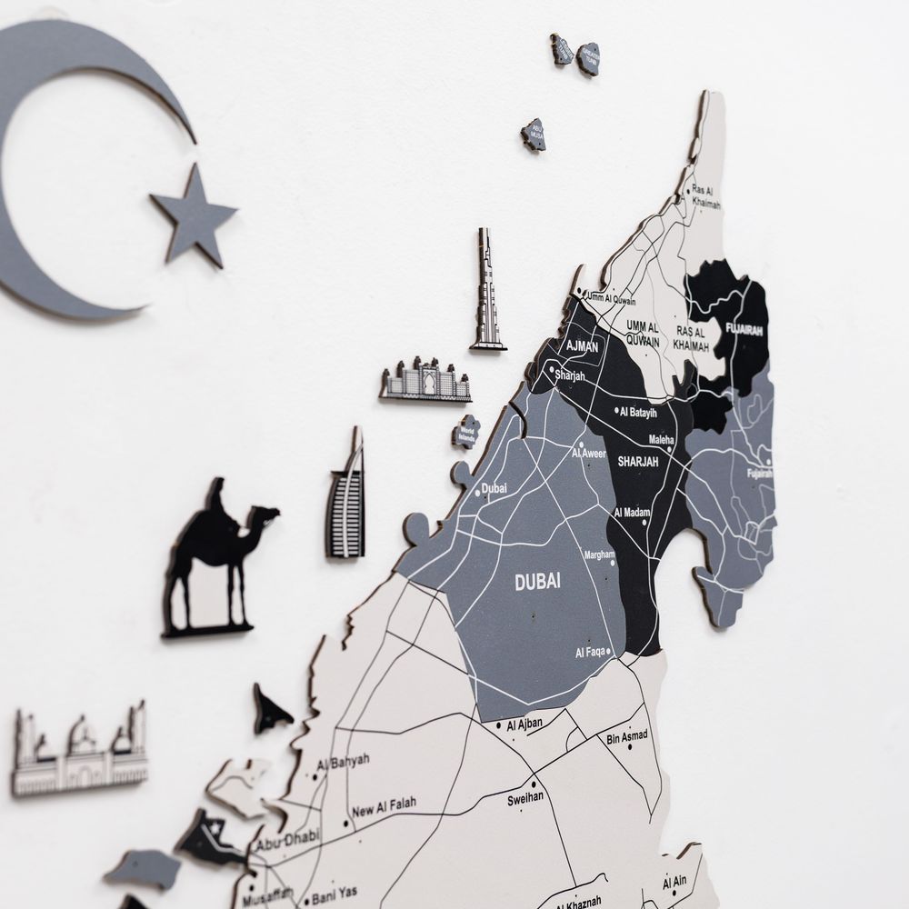Please Note: This map is designed for decorative purposes and may not provide precise geographical accuracy of the UAE. Each map is a unique masterpiece, showcasing natural variations in wood grain and color that enhance its character and individuality 🌲.