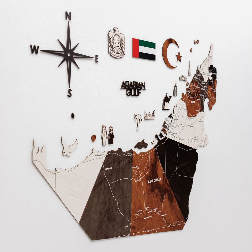 Please Note: This map is designed for decorative purposes and may not provide precise geographical accuracy of the UAE. Each map is a unique masterpiece, showcasing natural variations in wood grain and color that enhance its character and individuality 🌲.
