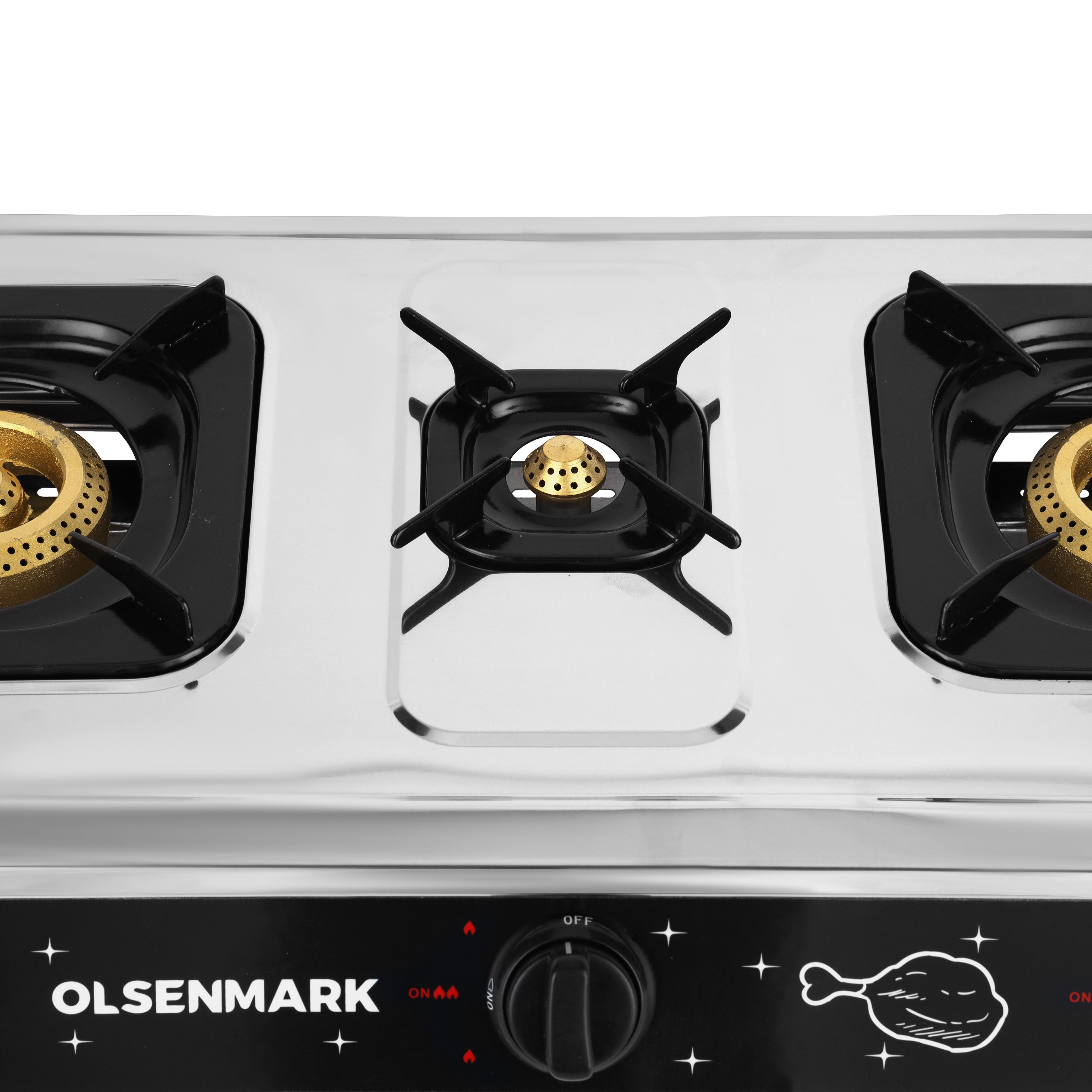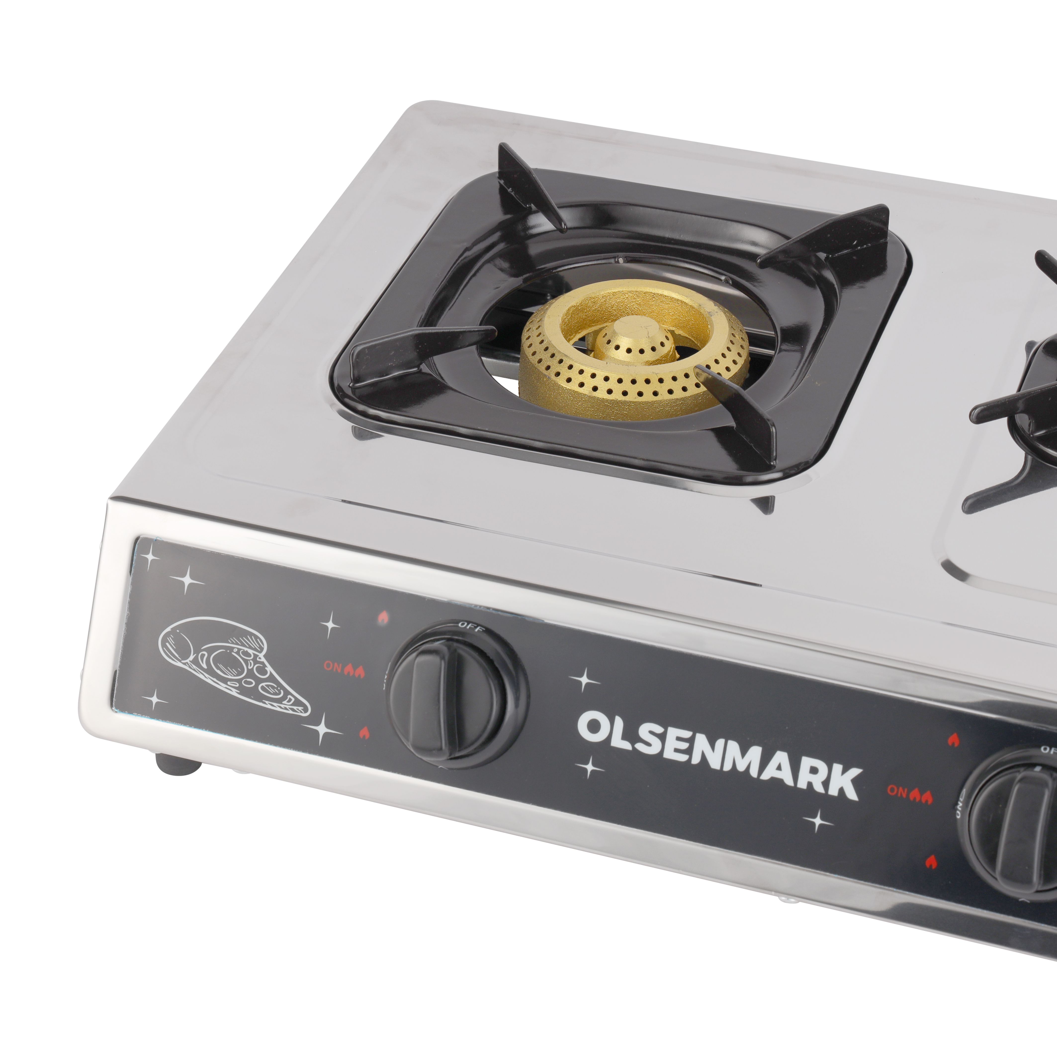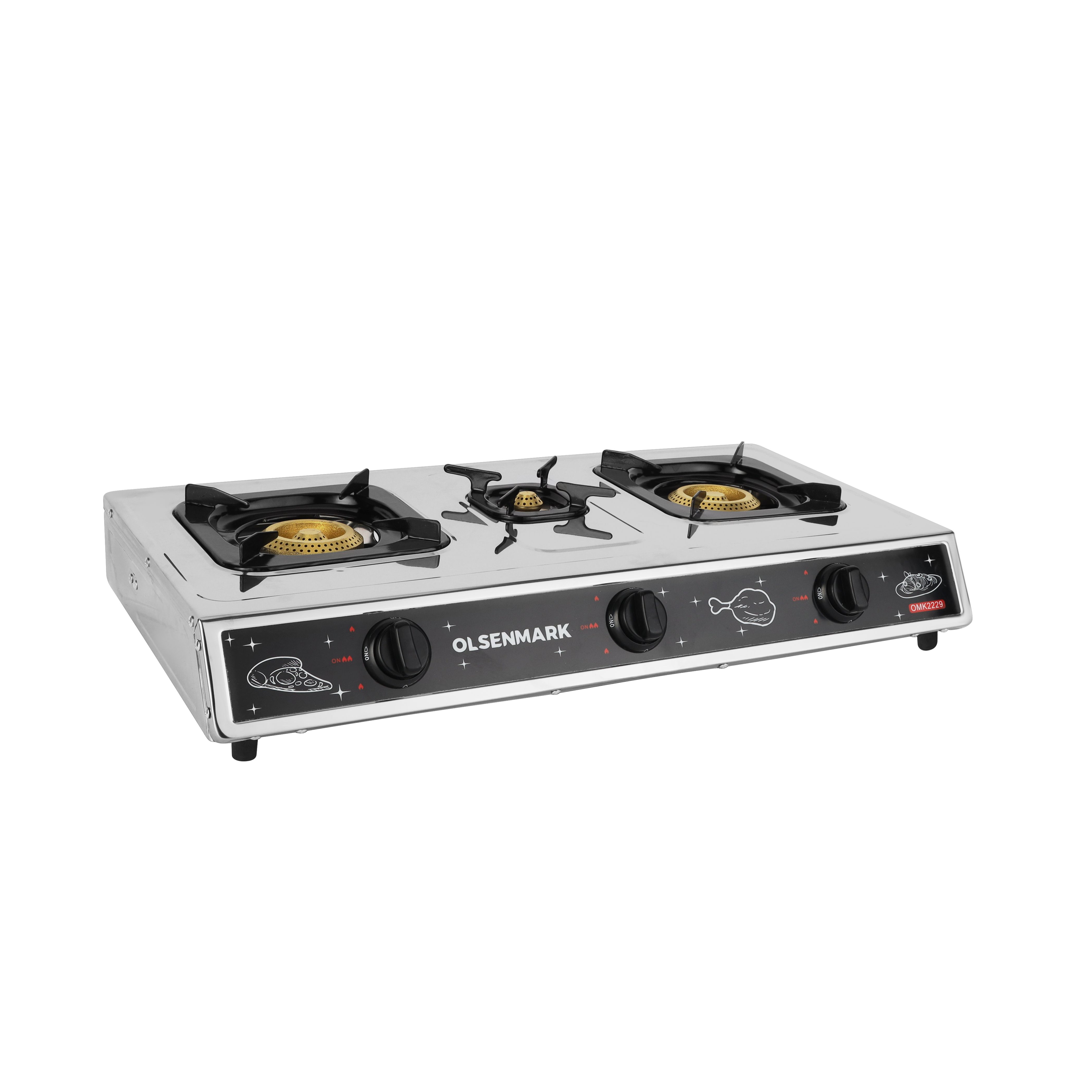 Cooking has never been easier or more enjoyable with our hassle-free cooking system. Designed for ease with safety in mind, the Olsenmark gas stove is constructed of top-grade stainless steel materials. This classic and stylish stove in silver and black enhances the look of your kitchen counter, and it is made from the highest quality materials. This versatile gas stove makes cooking safe and convenient with its three high-efficiency cast-iron burners. The burner has low gas consumption. The heavy-duty cast iron burners are designed to accommodate even large-sized utensils with 100g+30g+100g cast iron burners. The gas burner has a piezo-igniting feature and comfortable grips that help with safe handling. Due to their innovative design and high-quality pan supports, utensils are stable and stay in place while cooking. In addition to looking stylish, the modern stovetop is also efficient and durable. This stove can be used every day. The cooktop is also easy to clean and maintain and lasts a lifetime. This stovetop comes with detachable, high-quality pan support. The cooktop does not take up much space in your kitchen and can easily be moved around. It measures 710x370x85 mm and weighs 3.23 kg. The three burners have improved gas flow, which distributes fire and heat evenly, so your meals cook faster. In addition, the stove has low gas consumption, ensuring a better flame for faster cooking. It is also convenient for daily use. The water tray is composed of quality materials that provide durability and are long-lasting. The easy-to-control ABS knobs with ON and LOW indicators will make cooking easier. This gas burner is a thoughtful gift option that will impress your loved ones with its simple and elegant design. It will be a wonderful addition to your kitchen to have this aesthetically pleasing and economical gas stove. The Olsenmark gas cooker comes with a 2-year warranty.'