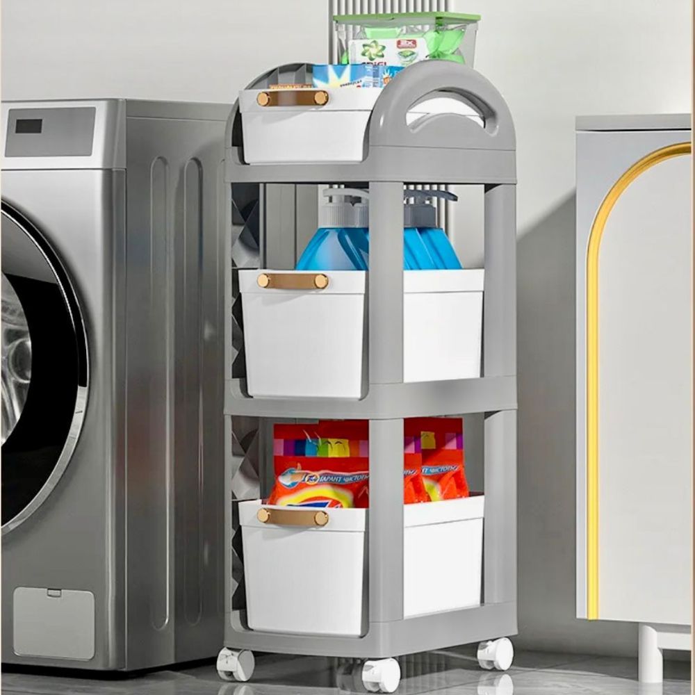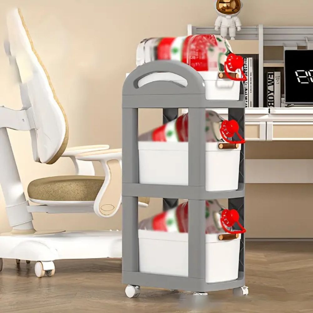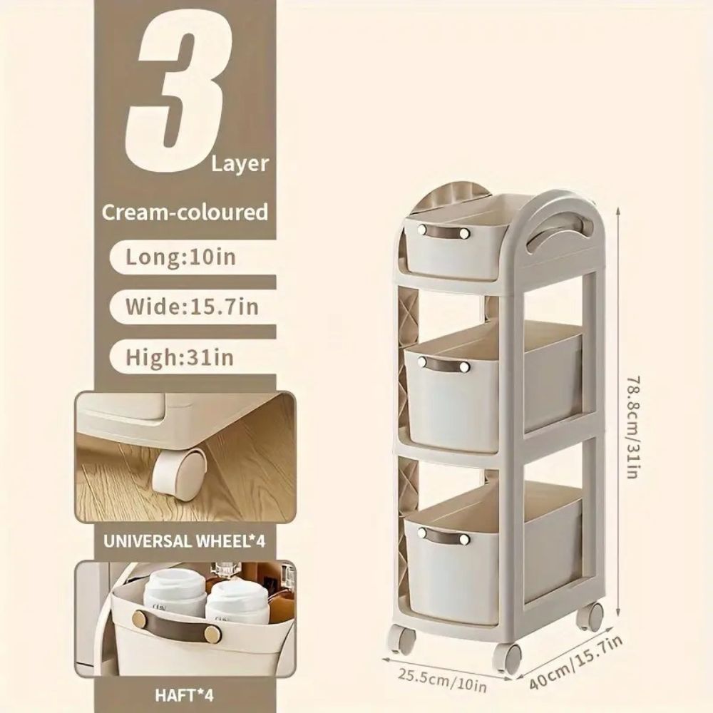 A 3-layer trolley with drawers and wheels offers convenient, organized storage with three tiers of pull-out drawers