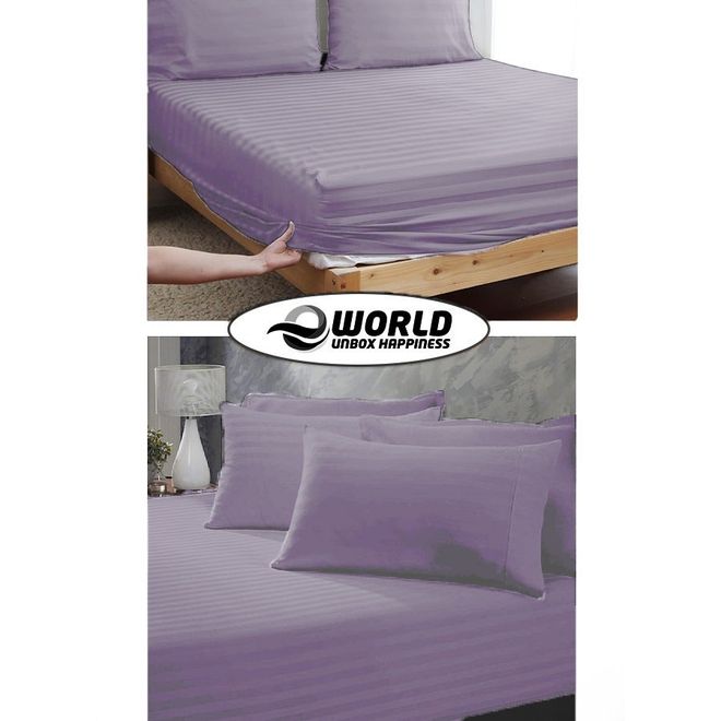 The product 3 Piece Luxury Lilac Striped Bed Sheet Set with 1 Deep Pocket Fitted Sheet and 2 Pillowcases for Hotel and Home Crafted from Ultra Soft and Breathable Cotton for Year-Round Comfort, Single images have props used for illustrative purposes. Product Color may vary slightly due to photographic lighting or your screen settings.